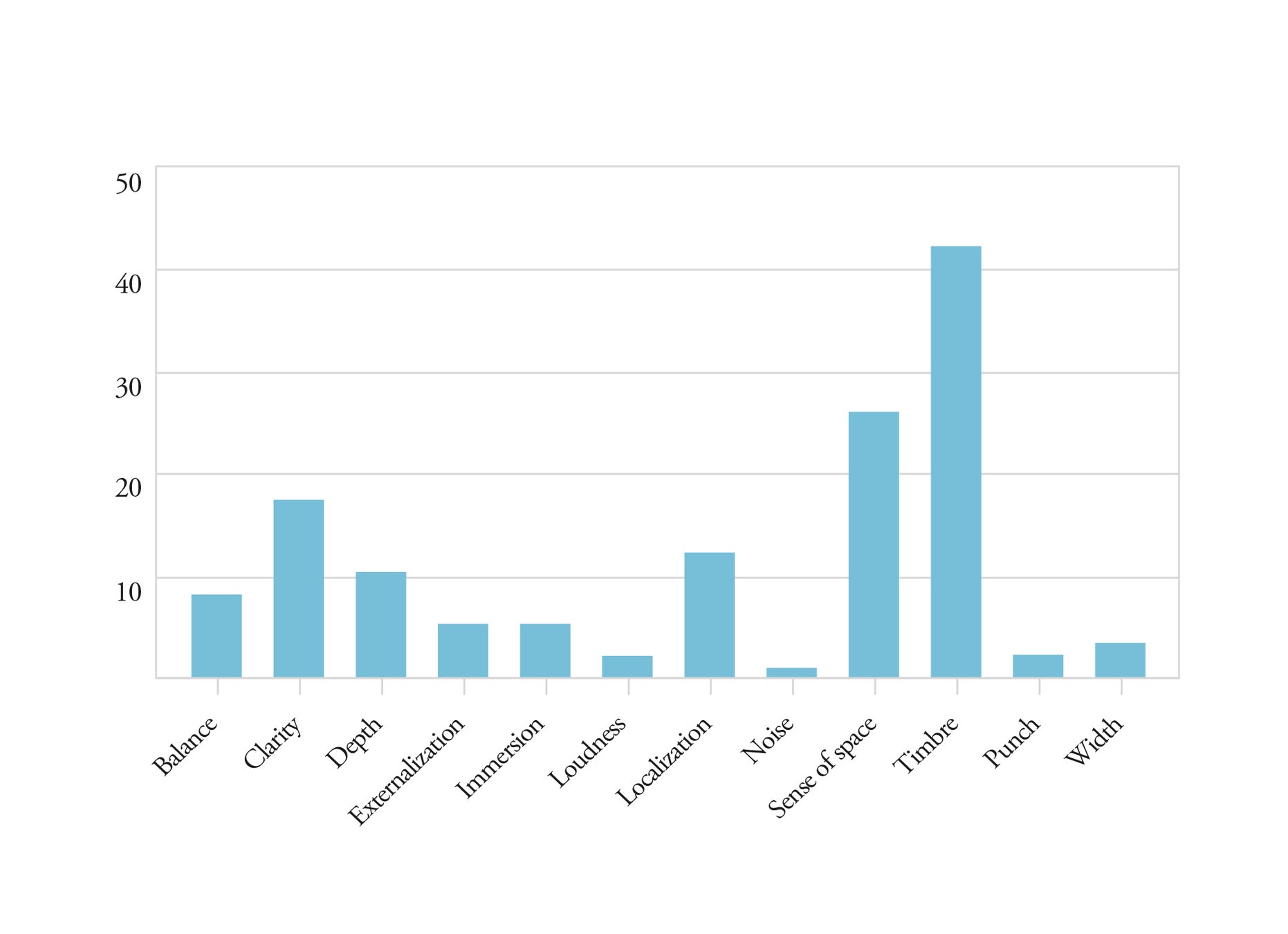 一例をあげれば、以下のグラフは、VR(Virtual Reality)コンテンツの再生実験中の音に関する発言を分類し、その数を示したものです。空間の再現性が重要と思われがちなVRコンテンツでも、音色(Timbre)が最も優勢で、空間感覚(Sense of space)が2番目であることがわかります。[1]
