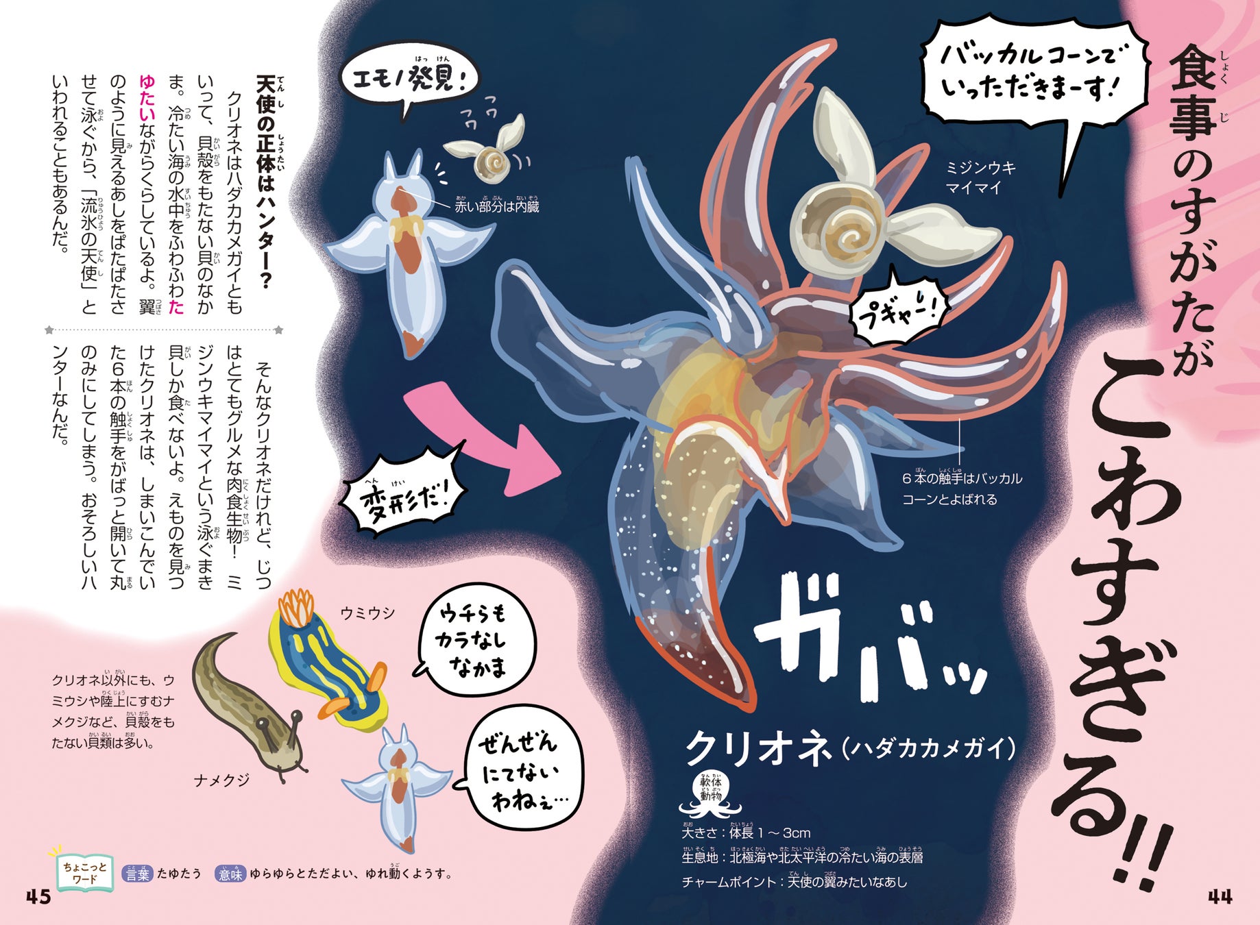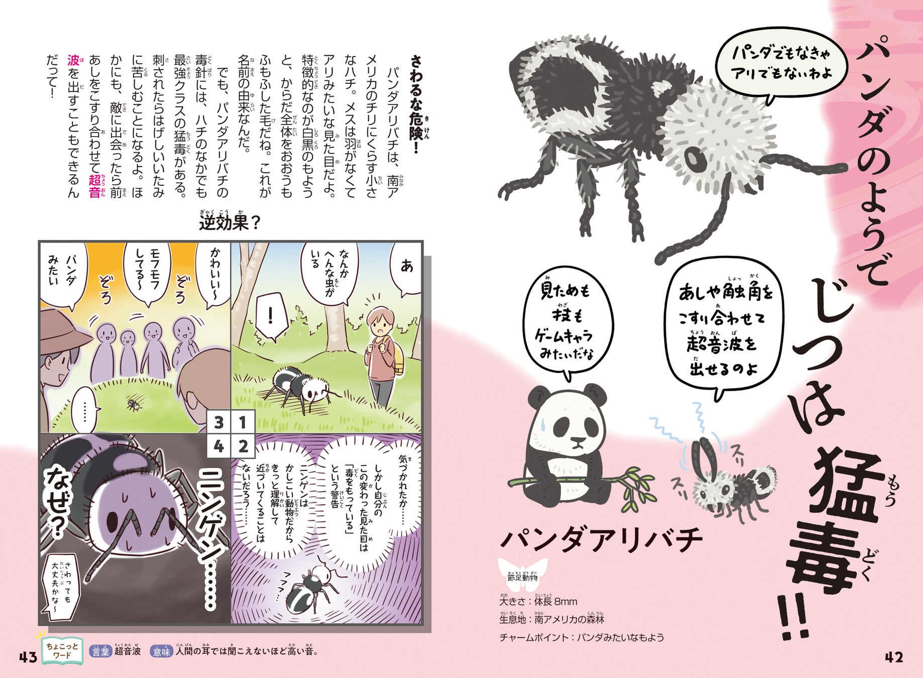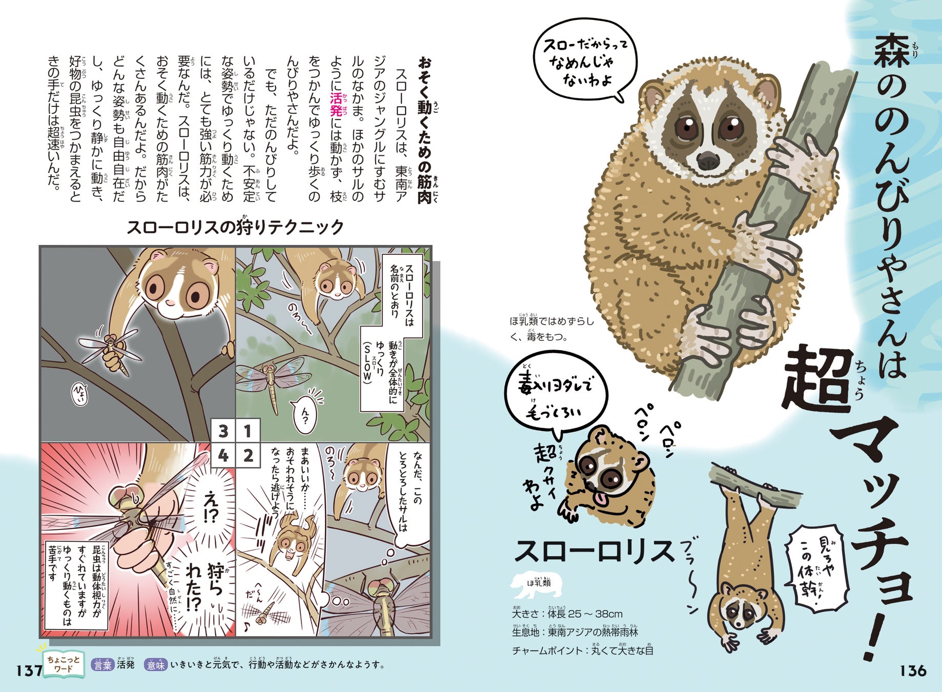 読書が苦手なお子さんにも楽しく読んでもらえるように、全ての生きもののページにマンガを掲載しました。見開き展開なので、ちょっとした時間に読めるのもポイントです。