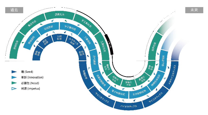 このような社会変革に向かうために、SINIC 理論という未来予測理論に基づく未来ダイアグラムが活用できます※2。これは、1970年の大阪・関西万博開催と同時期に、オムロン創業者立石一真らが発表したものです。今では、オムロンのみならず、若い起業家、大手企業の経営層、国や自治体の共感や活用が急増しています。