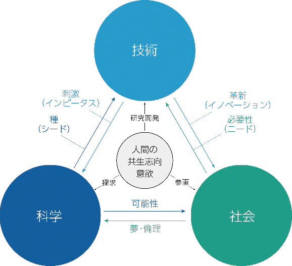 その特徴は、100万年の人類史をたどり、科学、技術、社会の相互作用の円環的関係から未来社会を予測するというものです。現在は、産業革命以降の社会発展を実現させた、モノや個の価値を重視する工業社会、情報社会から、心や集団の価値の再評価を経て、新たな豊かさを享受する「自律社会」、「自然社会」への大転換 期「最適化社会」です。自律に向かうためには、分散型ネットワーク社会や、再生による価値創造、倫理的資本主義への針路を定め、新たな価値のモノサシと経済システムづくりが必要です。