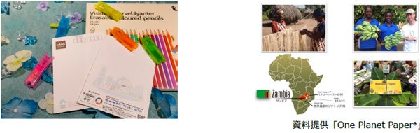 ■バナナペーパーはアフリカ・ザンビアのオーガニックバナナの繊維と森林認証パルプから出来ています。収穫ごとに廃棄されるバナナの茎を原料とし、製造工程を村の人々が担うことで、環境を守り貧困を減らします。2016年紙業界としては日本初となるフェアトレード認証を取得したサステナブルな1枚です。