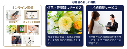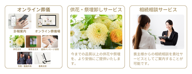 また、オンライン葬儀機能だけでなく、供花卸しサービスや相続相談サービスをご提供しております。