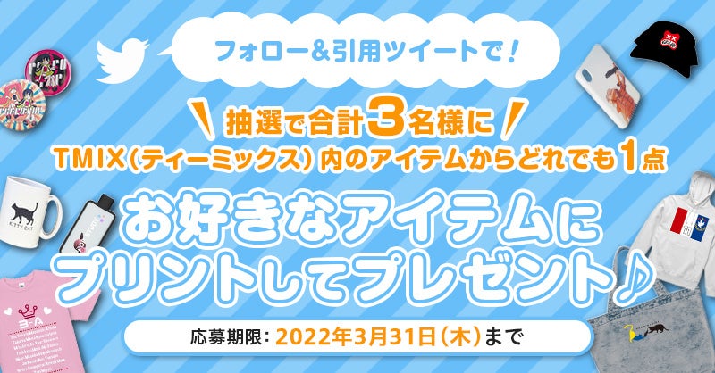キャンペーン開催期間中、TMIXの公式Twitterアカウント https://twitter.com/tmix_jp をフォロー後、対象ツイートを引用ツイートした方の中から抽選で自分の好きな写真やイラスト・文字・スタンプでデザインできる、オリジナルアイテム どれでも好きなもの1点を計3名様にプレゼントする「春の新生活応援!プレゼントキャンペーン」を実施いたします。