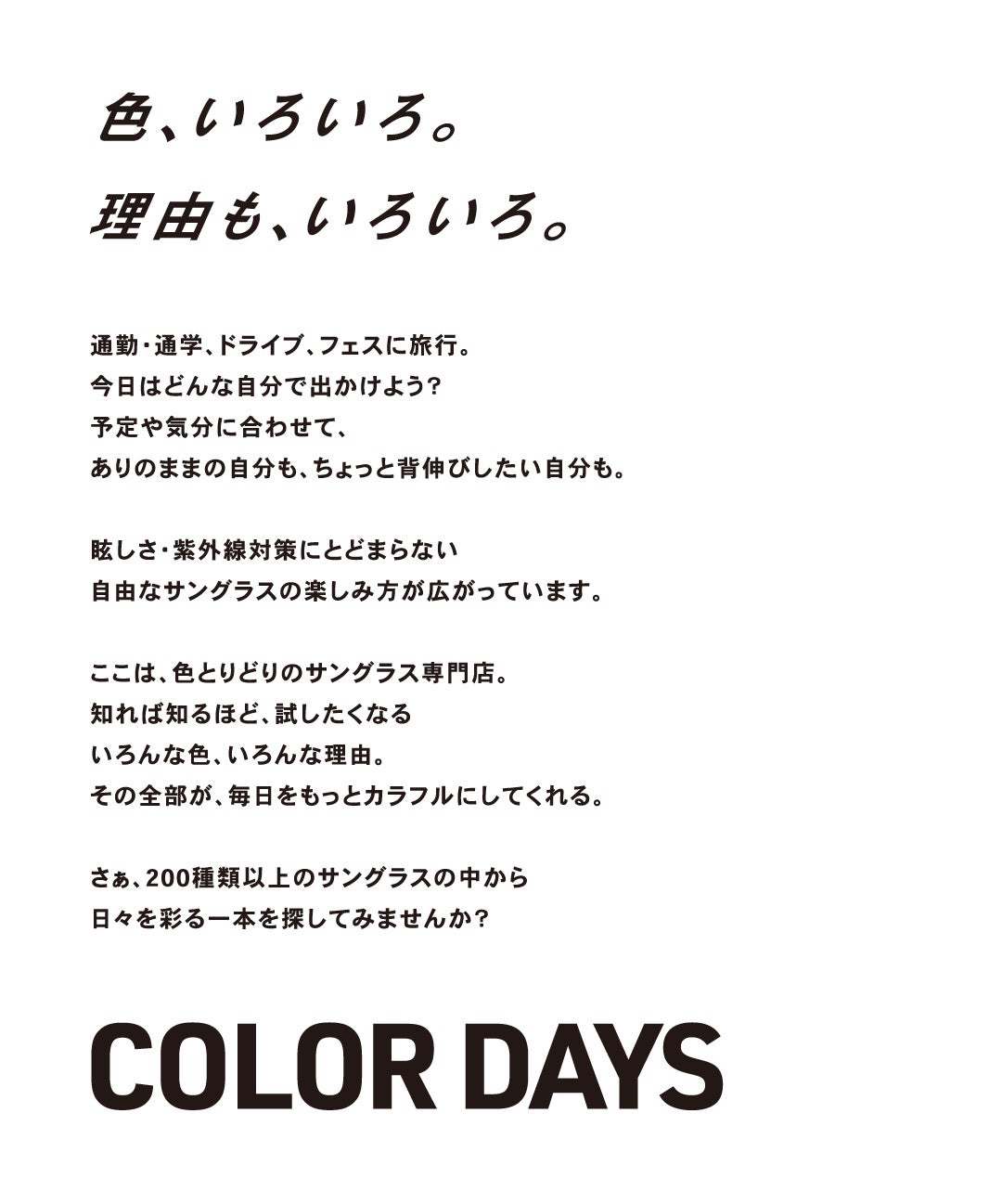 OWNDAYSはサングラス・カラーレンズメガネに特化した、『COLOR DAYS』ポップアップストアを初開催します。店舗では200種類以上のサングラスや、カラーレンズなどを展示・販売を予定しており、多様なスタイルやニーズに対応したラインアップとなっております。本ポップアップストアでは、6名のイメージモデルが、それぞれ厳選したサングラスを紹介。各モデルの選定理由やコメントもご紹介し、商品の魅力や商品の新しい選び方をより深くご体感いただけます。