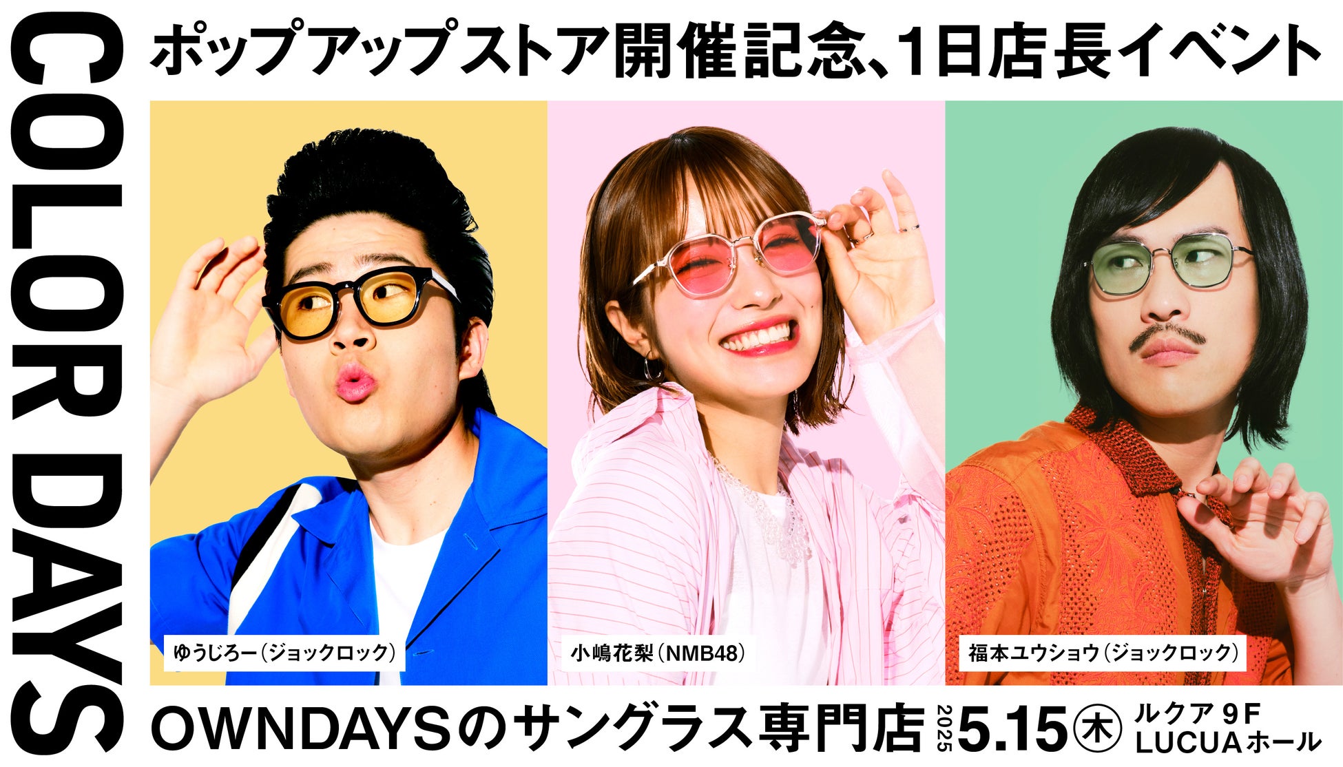 メガネ・サングラスの製造販売を手掛ける株式会社オンデーズ(本社:東京都品川区、代表取締役社長:海山丈司)は、2025年5月16日(金)から20日(火)の5日間、ルクア 9F LUCUAホールにて、サングラス専門店としてポップアップストア『COLOR DAYS』を開催します。開催を記念して、イメージモデルであるNMB48の小嶋花梨さんと結成から約2年半でM-1グランプリ2024のファイナリストとなった芸人のジョックロックのお二人をお招きした、1日店長イベントを5月15日(木)に開催することが決定しました。さらに、お三方が着用したサングラスが当たるSNSキャンペーンを5月1日(木)20:00から開始します。