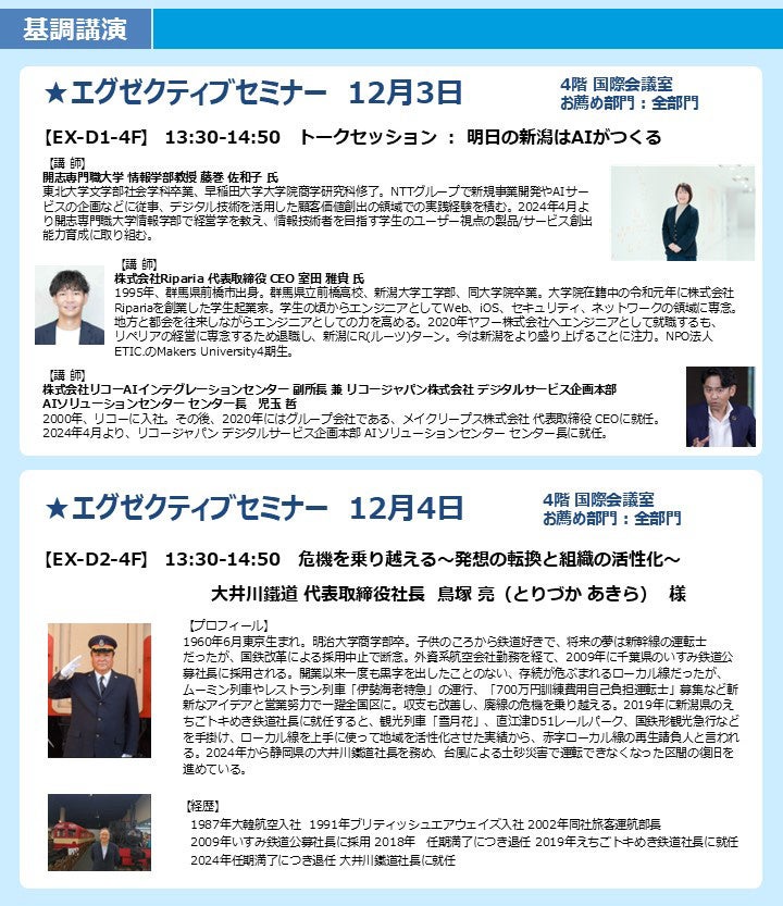 セミナーには各分野に精通したプロフェッショナルが登壇し、AIやセキュリティ、脱炭素などの最新事例や、実践的なノウハウをご紹介します。また地元の大学や企業から講師をお招きしてのトークセッションも開催します。