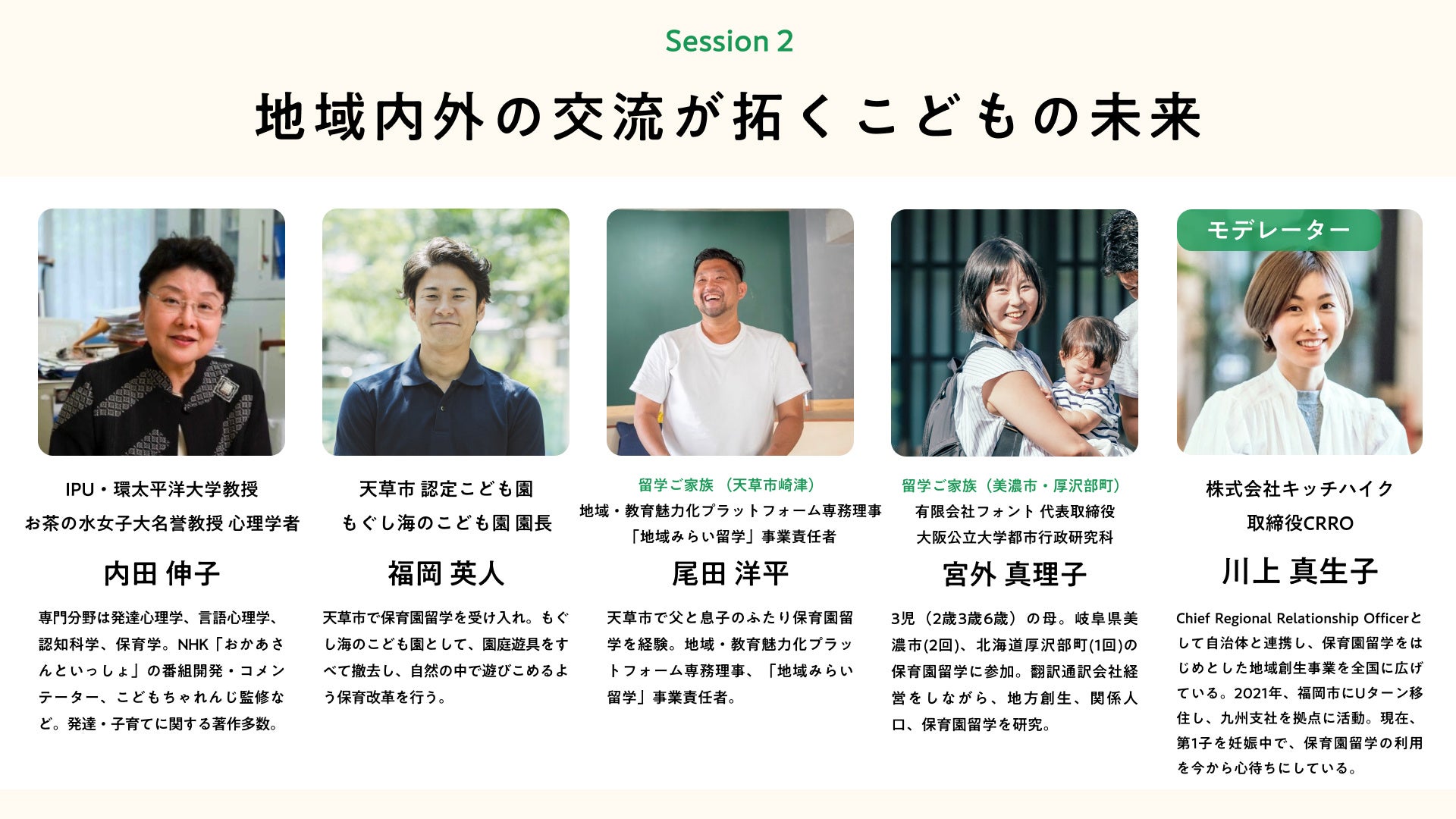 発達心理学の専門家の知見も交え、保育園留学を通して、幼少期に多様性にふれる経験がこどもの成長や、非認知能力にどのような影響を与えるかについて、受入園の当事者・留学を経験したご家族の視点に加えてディスカッションします。留学を経験するこどもにとっての経験になるだけでなく、受入地域のこども達にとっても刺激を受ける経験となることなどを具体的な体験を元にお話しいただきます。