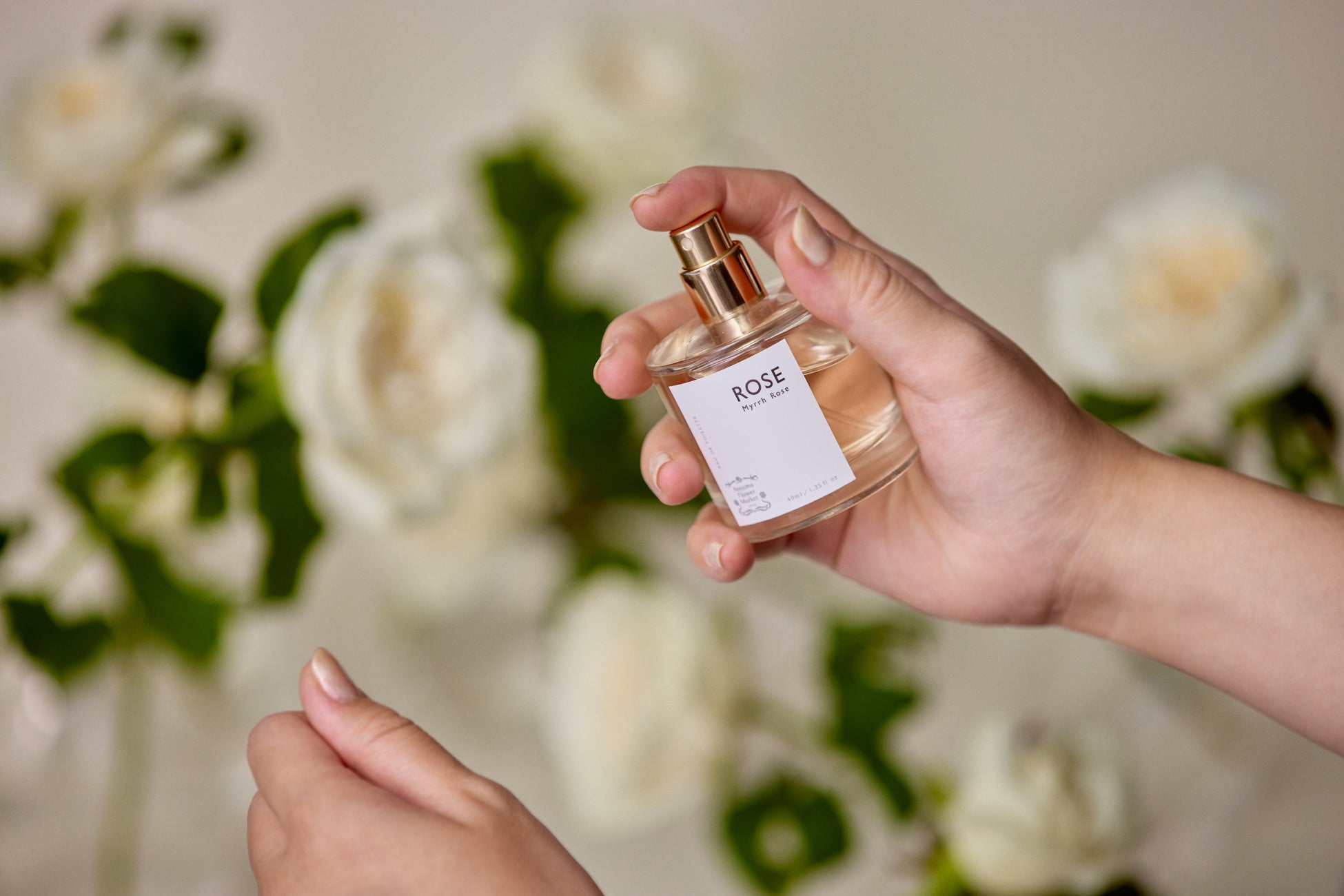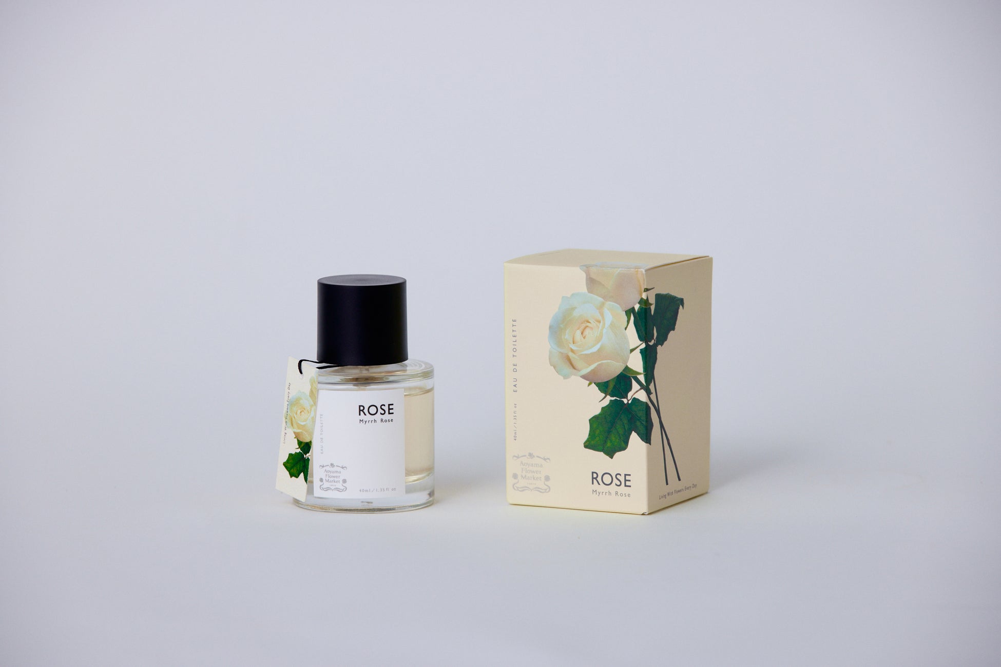 オードトワレ「ミルラローズ」には、清らかで優しい白色のバラ “シェドゥーブル”から抽出した贅沢なエキスを使用しています。そのエキスに通常の香料とは異なるフレーバーを用いた特別な処方を施すことにより、ダマスクやブルガリアンといった王道ローズとは一線を画す、他にはないローズのオードトワレに仕上げました。
