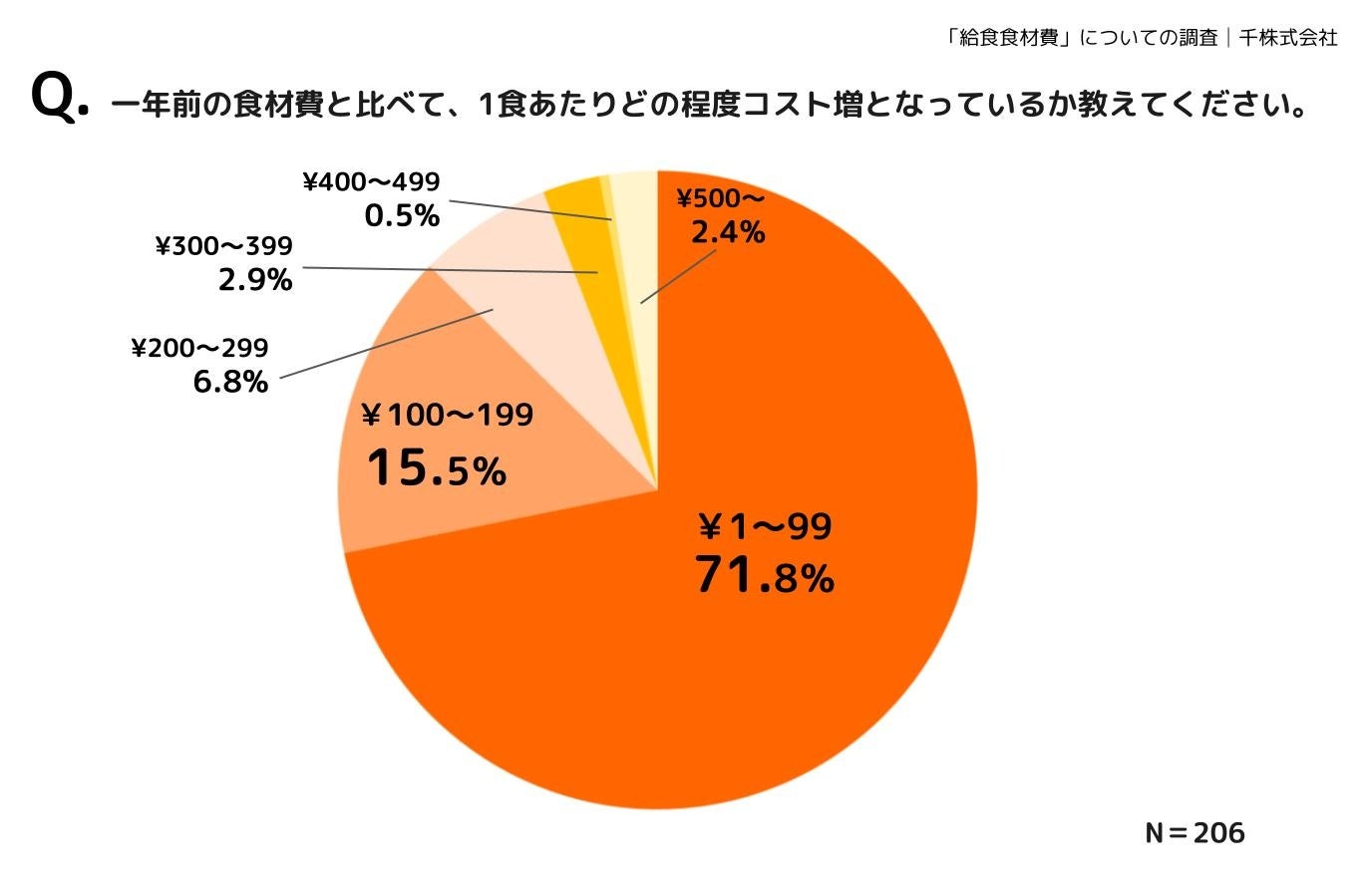 1年前の食材費と比べて、1食あたりどの程度コスト増となっているかを調査したところ、1食あたり平均で約81円のコスト増となっていることが明らかになりました。定員120名の幼保施設で月20日給食を提供していると仮定した場合、月20万円、年間約240万円のコスト増となります。