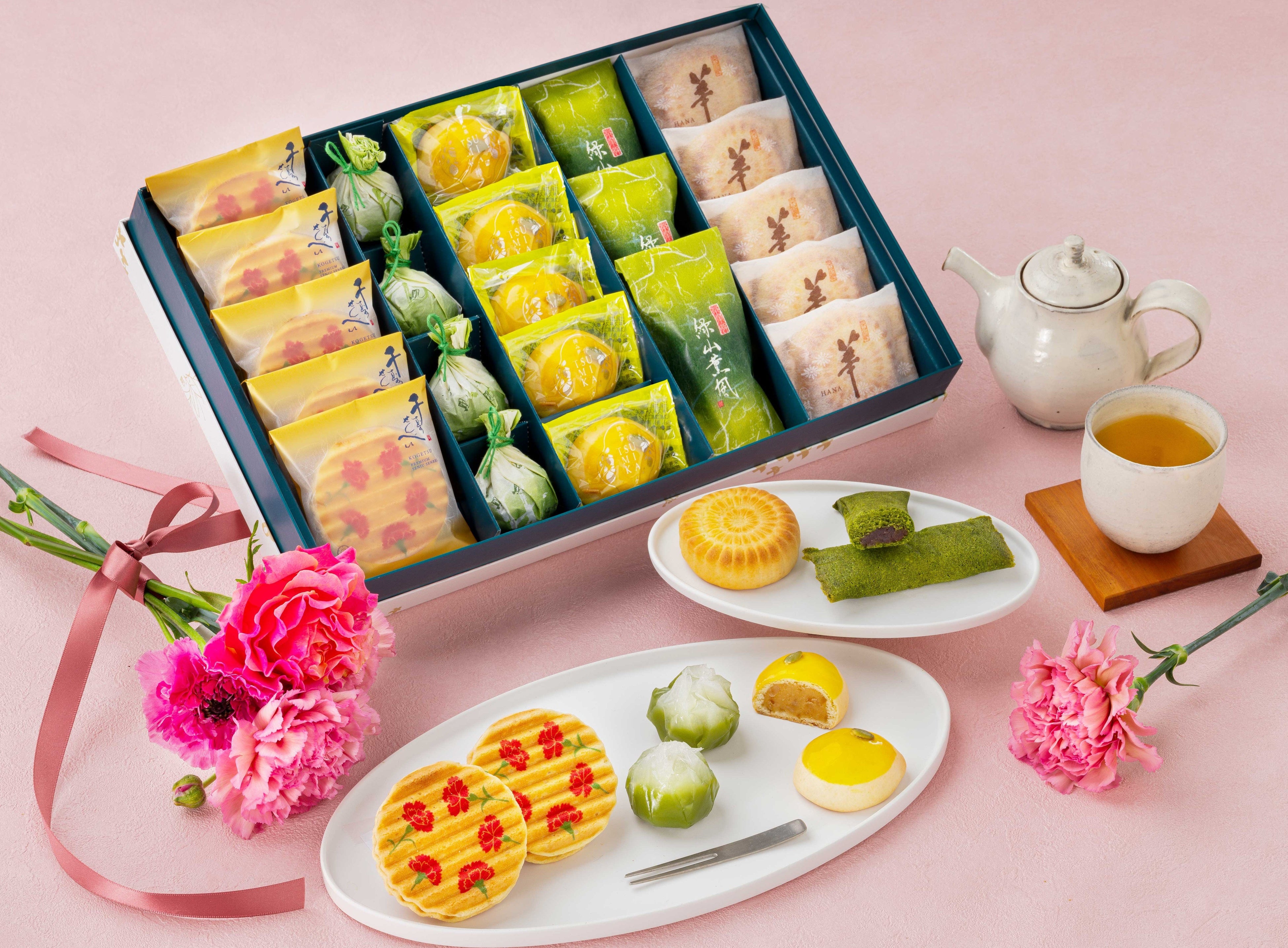 2.「母の日プレミアム千寿せんべい」に加え、季節限定の白餡にレモンピールの食感が楽しいミルク風味のフルーツ饅頭「爽々」、宇治抹茶「天峰」を贅沢に使用した生地でこし餡を包み焼き上げた「緑山薫風」の詰合せを今年もご用意いたしました。昨年度は1000箱以上のご注文をいただいた、鼓月人気の詰合せギフトです。