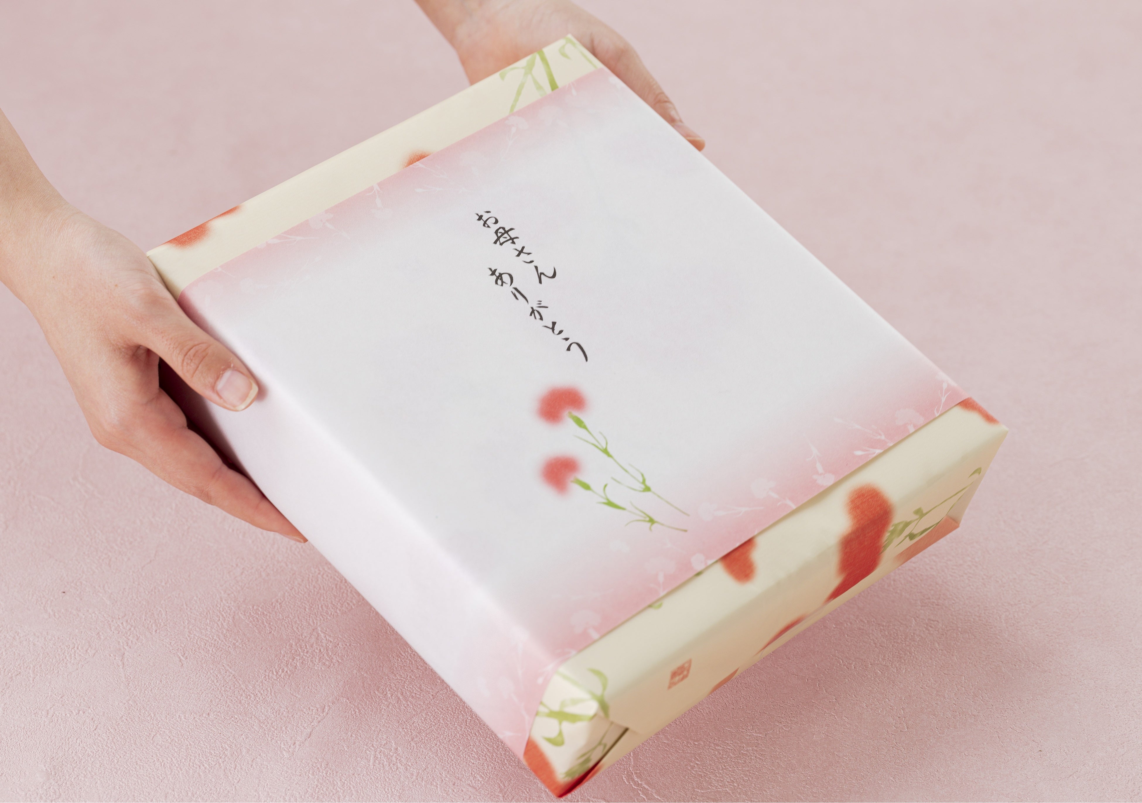 優しい色合いとカーネーションデザインが可愛い母の日専用の包装紙でお包みしたあと、「お母さんありがとう」の言葉を添えたオリジナルの掛け紙をおかけして大切なお母さんのもとへお届け致します。