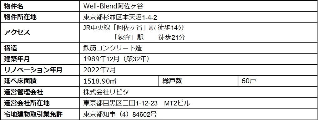 また、第一弾物件として『Well-Blend阿佐ヶ谷』(建物所有者:ジェイアール東海不動産株式会社)を開業し、2022年9月上旬より入居開始予定です。