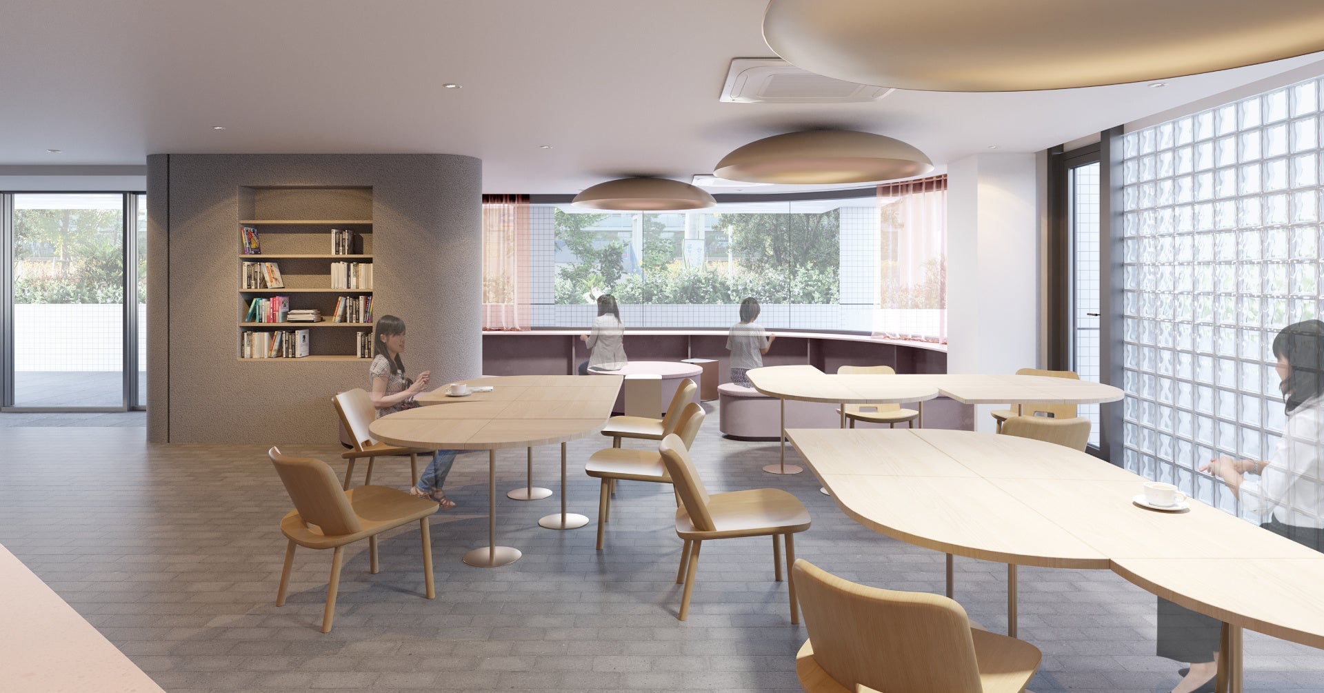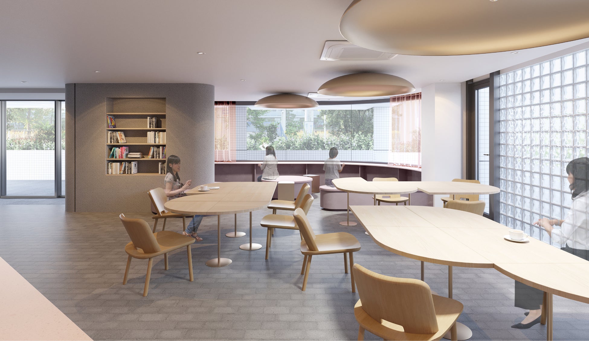 施設内のコモンスペースではジャズをBGMに、本物件のために選書された書籍を楽しめるブックサロンをご用意しています。また多世代が混ざり合う仕掛けとして、コモンスペースの一部には地域の方も利用可能なオープンラウンジを計画。