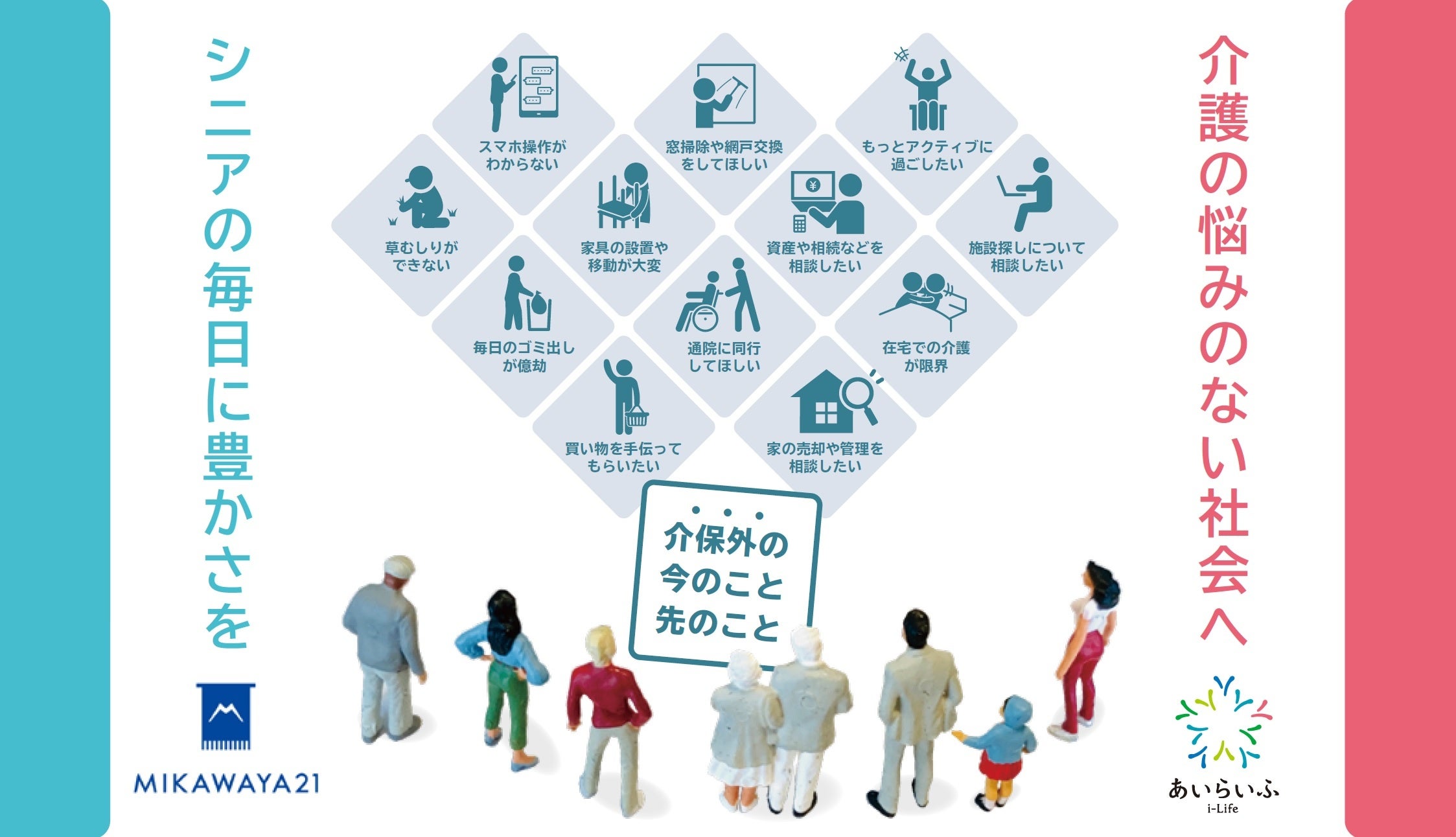 あいらいふでは、今後も介護保険制度や居宅介護支援システム、地域包括ケアシステムの維持・継続に寄与し、高齢者の多様なニーズに応える介護保険外サービスを開発・提供することで、高齢社会の課題解決に努めてまいります。