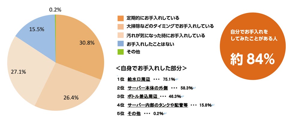 大半の利用者が自身でウォーターサーバーのお手入れを行っていることは、消費者の衛生意識の高さを示しています。しかし、自分でお手入れをしたことがあると回答した人でも、自身でお掃除できる箇所は、ウォーターサーバー本体の外部に留まっている人が多く、ここにサーバーのメンテナンス(衛生管理)に対する課題があると考えられます。