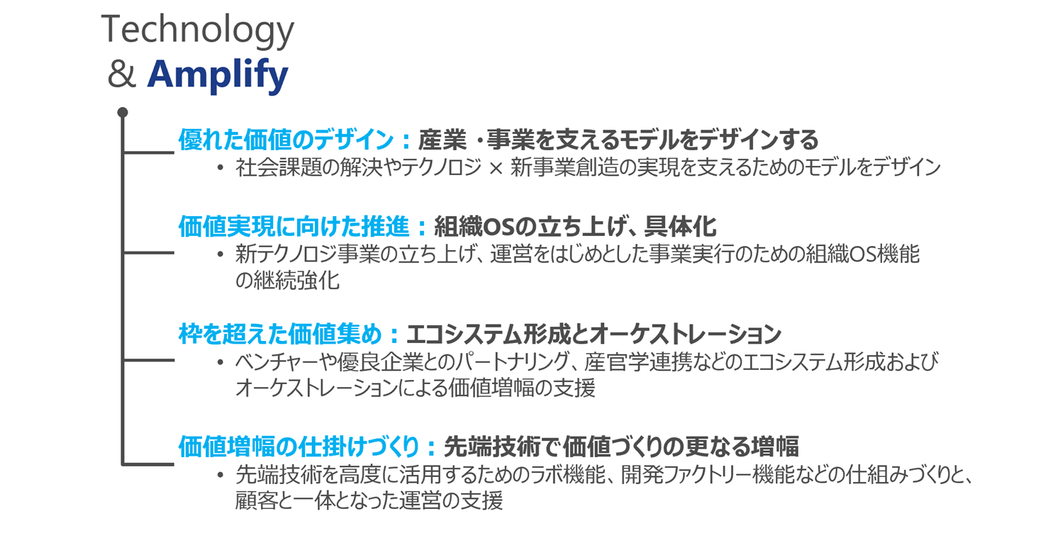 そのような環境の中、DIにおいても、クライアントにおけるインパクトの創造、事業価値の創出・増幅に向けて、従来以上に踏み込んだご支援を可能とするべく、新たなプラクティス 「Technology & Amplify(テクノロジー&アンプリファイ)」を発足致しました。