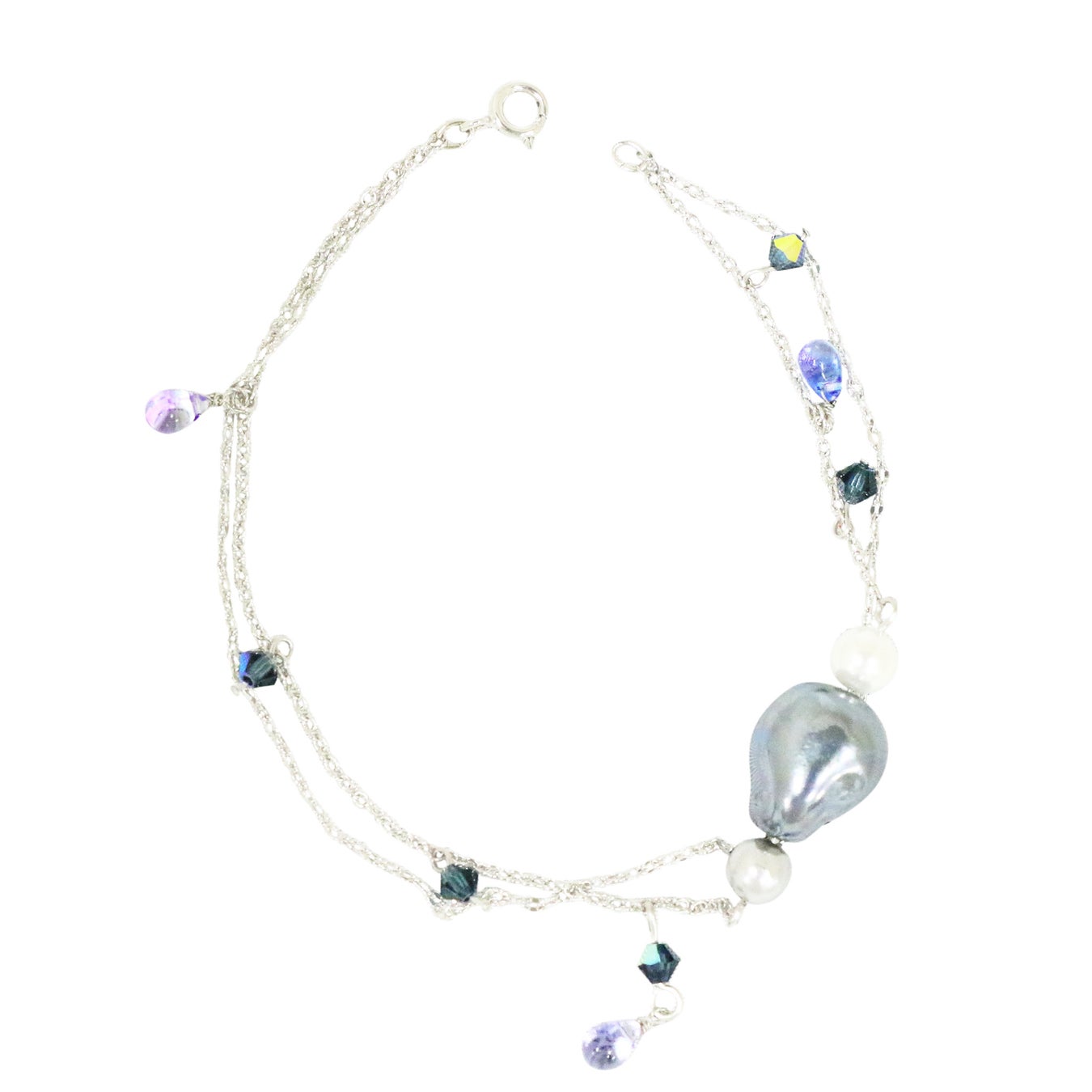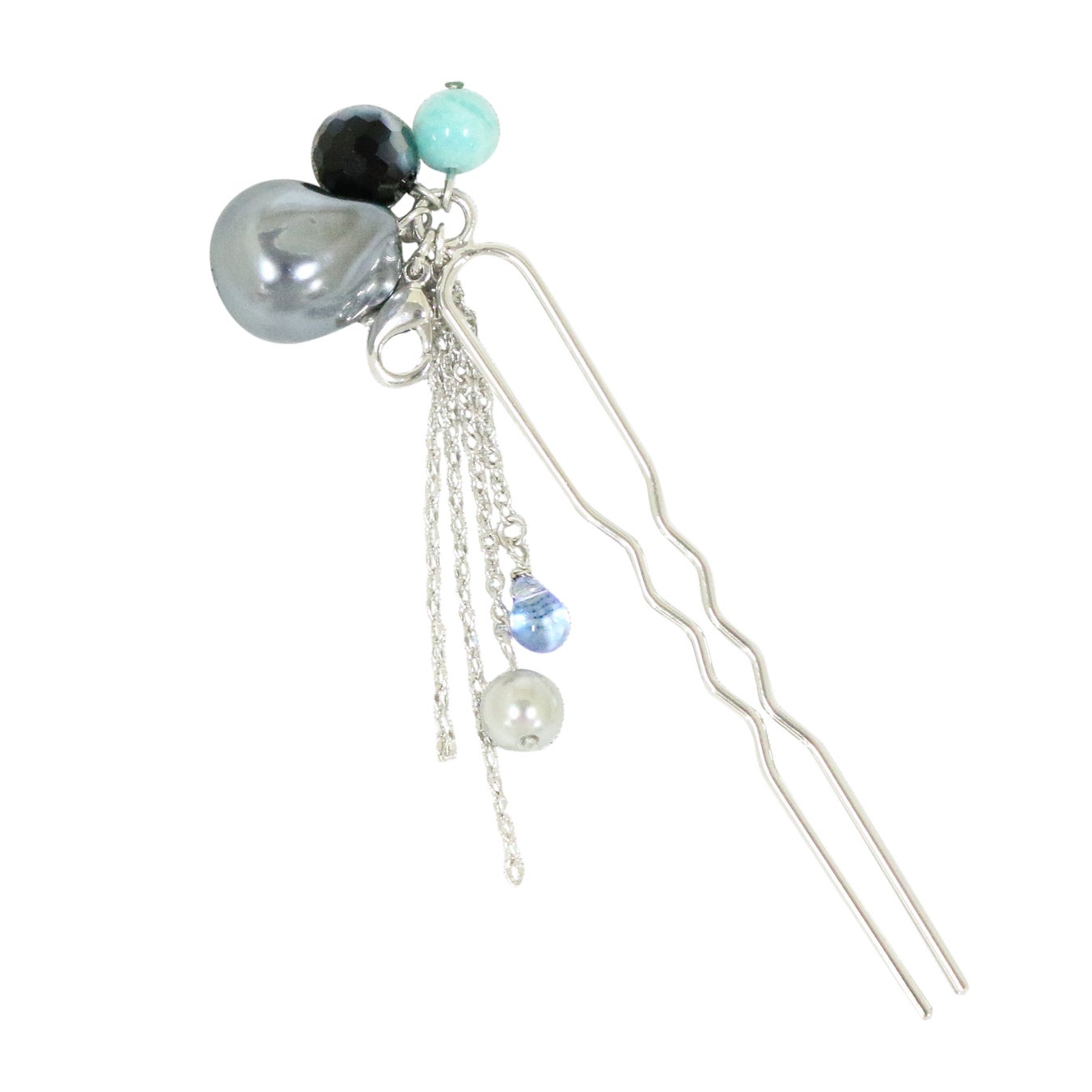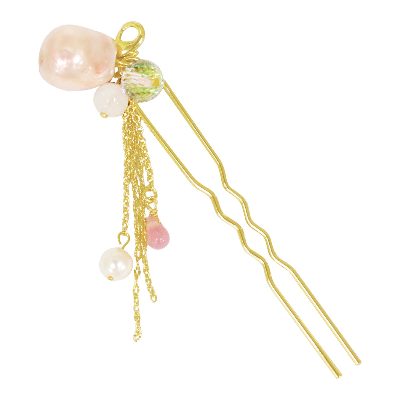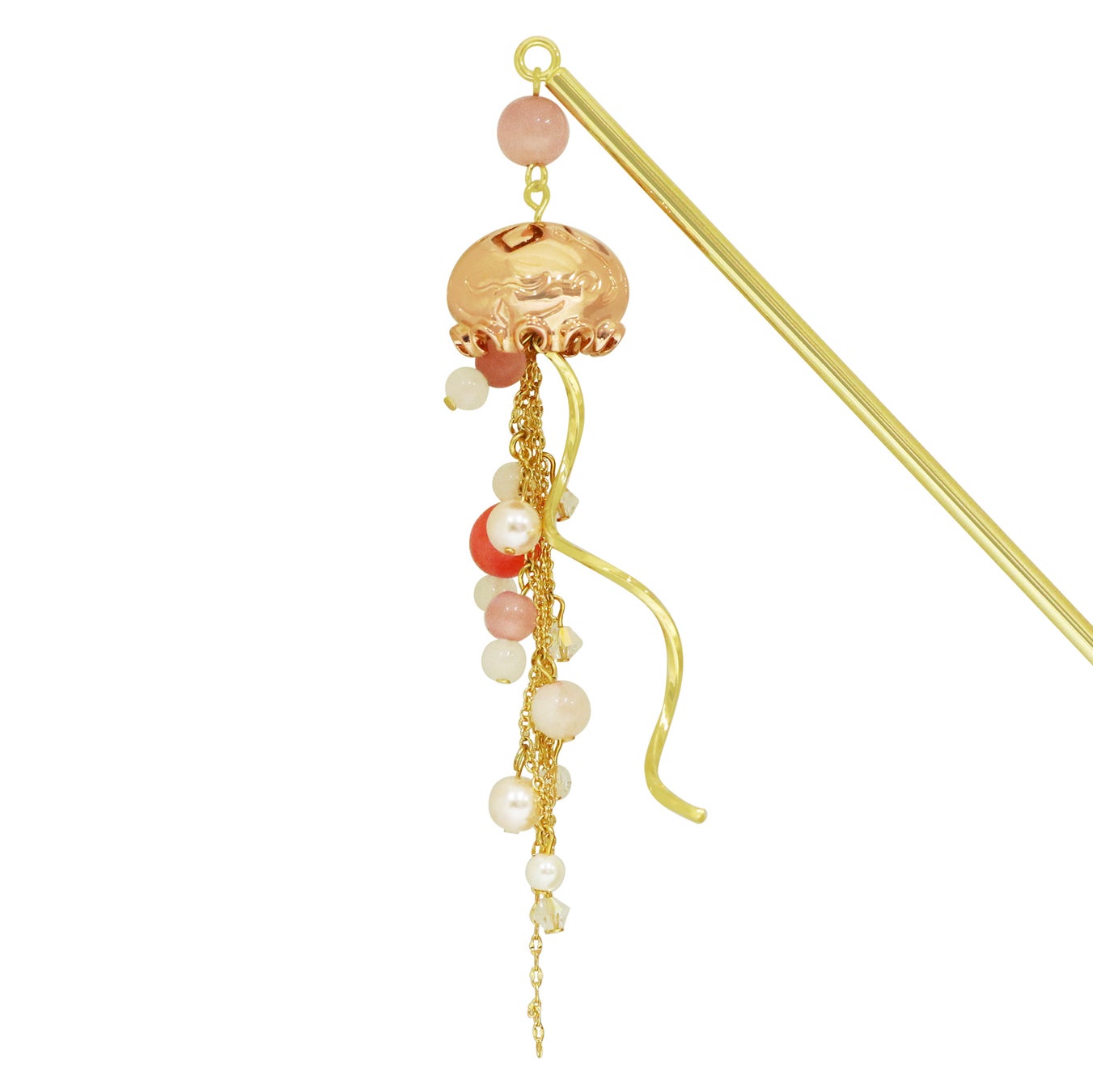深海で揺れる海月のモチーフに、幸運を象徴するバロック風の輝きと、泡沫を思わせる丸いビーズをあしらったデザイン。波模様を刻んだ海月のパーツと、水面の煌めきを表現したチェーンが、動くたびに繊細な光を放ちます。チャームは取り外し可能で、簪とブレスレットの2wayで楽しめます。