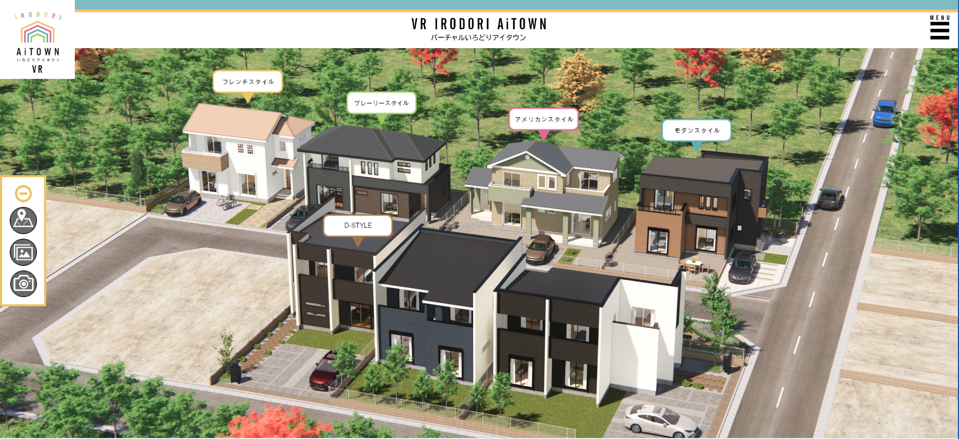 「VRいろどりアイタウン」は、360°VRの住宅プランの内外を自由に見ることができ、また、屋根や外壁、クロスや建具やフローリングカラーなど、分かりやすいシミュレーションによりお客様の理想に添ったマイホームをご提案致します。