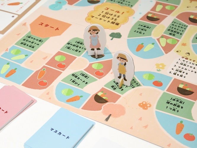 このボードゲームは、サイコロを振ってコマを進めながら野菜を育てて販売することで、普段食べている野菜の栽培過程を学ぶことができる知育玩具です。プレイ人数は2~4人、対象年齢は8歳以上です。コマを進めながら「種」「芽」「花」「青果」などの順に野菜を生育させていきます。生育途中には「水やり」「草刈り」などの、実際に栽培過程で必要となる栽培促進効果や、「遅霜」「猛暑」「害獣」などによる生育阻害イベントが待ち受けています。季節による栽培速度の違いや、資材活用の利点を学ぶことができます。様々な栽培過程やイベントを乗り越えて収穫した野菜は、ゲーム内の特別イベント「マーケット」で販売してお金に換えることができ、野菜の価格が出荷量により変動するため、大人も駆け引きを楽しめるゲームとなっています。