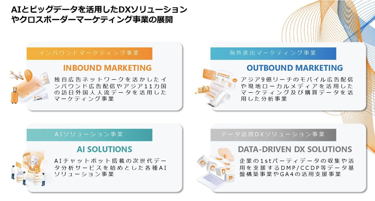 - 事業内容:独自AI技術によるビッグデータ解析事業、スマートフォン広告プラットフォーム事業、インバウンド・アウトバウンドマーケティング支援事業、DMP構築事業、クールジャパンDXサミット運営事務局