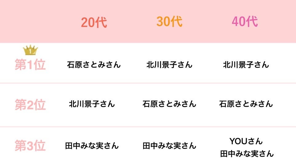 第1位「北川景子さん」、第2位「石原さとみさん」、第3位「田中みな実さん」