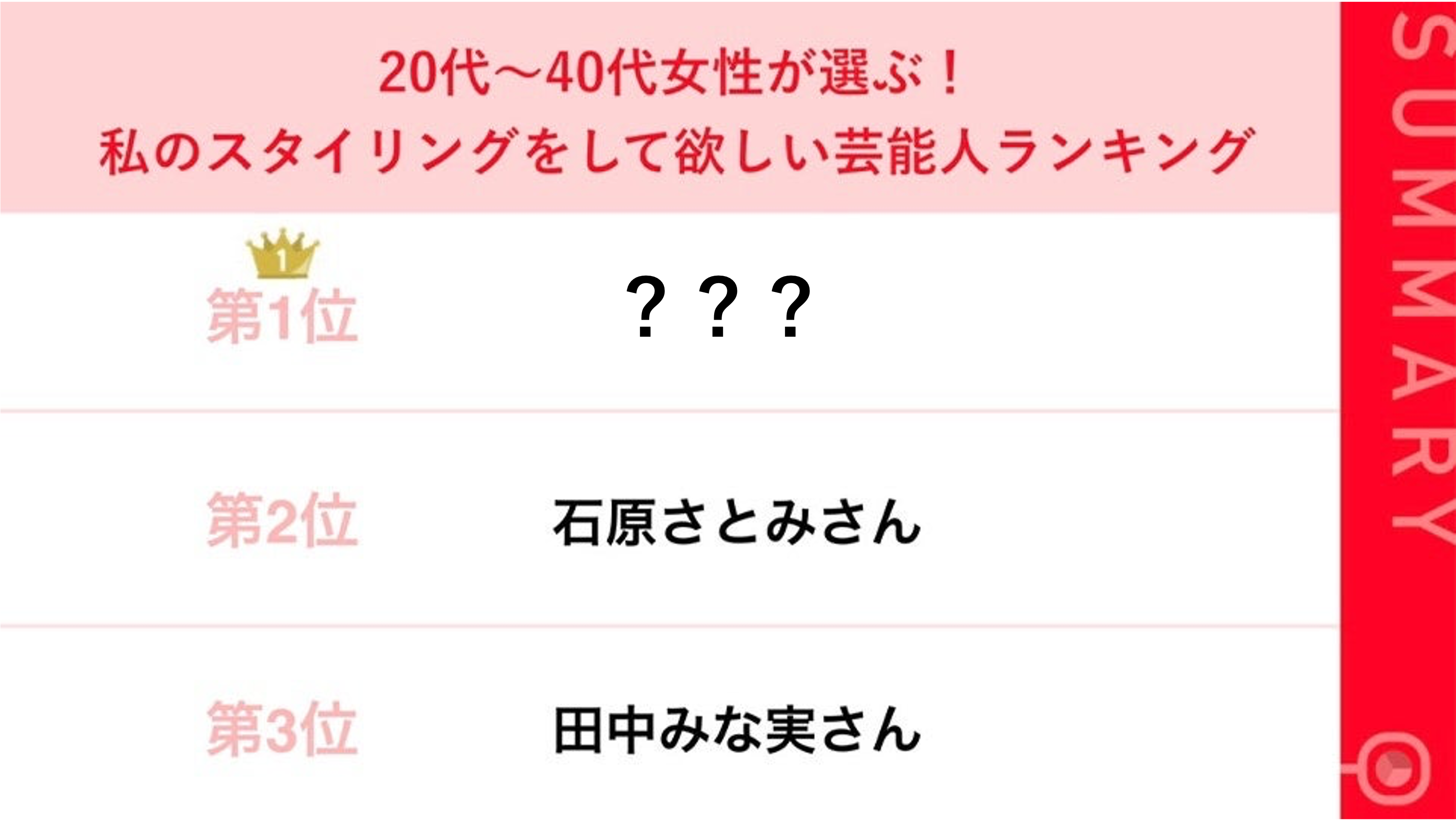 世代別!私のスタイリングをして欲しい芸能人ランキング総合第3位「田中みな実さん」、第2位「石原さとみさん」、第1位は憧れのあの女優?