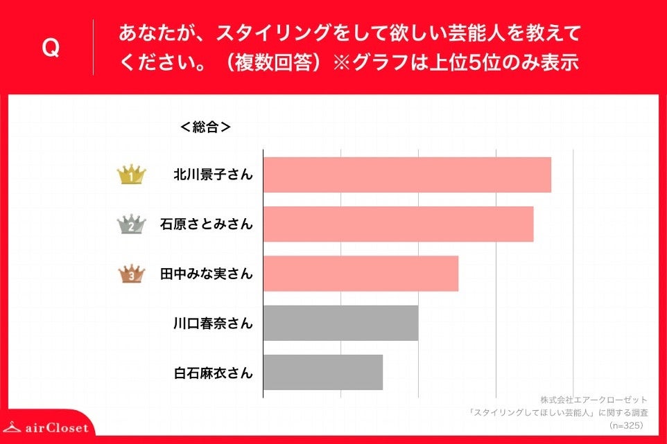 「Q.あなたが、スタイリングをして欲しい芸能人を教えてください。(複数回答)」(n=325)と質問したところ、最も投票数が多かった順に「北川景子さん」、「石原さとみさん」、「田中みな実さん」、「川口春奈さん」「白石麻衣さん」という結果になりました。