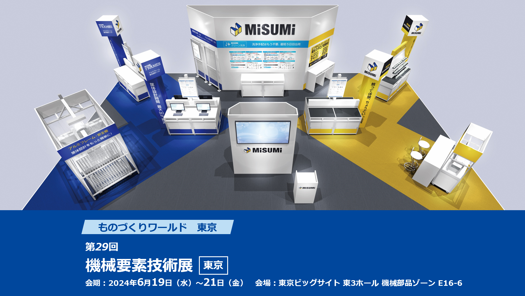 当社ブースでは、今回初展示を含むミスミの3つの商品・サービスを体感できるコーナーをご用意しています。当社類似品価格から平均45%OFFを実現した「エコノミーシリーズ」コーナーでは、商品を手に取り、当社類似品と見比べることで、「驚くほど低価格」「ちょうどいい品質」を実感いただけます。また、3DCADソフトを操作したことがない方でも簡単にアルミフレームの筐体設計が可能なソフト「MISUMI FRAMES」を実際の画面で体験できるコーナーに加え、クリーン洗浄品の初展示なども予定しています。