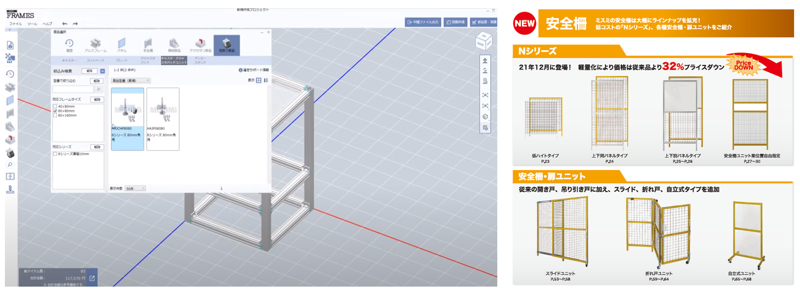 「MISUMI FRAMES」操作画面(左)、安全柵の商品例(右)