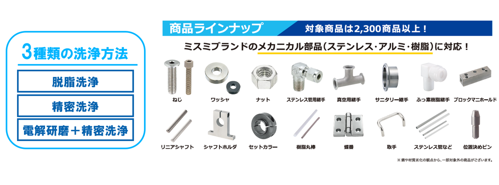 クリーン洗浄品とは クリーン洗浄品は、ミスミブランドのメカニカル部品に洗浄を施した商品です。納期は最短5日目出荷、お客さまのご利用環境に合わせて「脱脂洗浄」「精密洗浄」「電解研磨+精密洗浄」から洗浄方法をお選びいただけます。商品ラインナップはステンレス・アルミ・樹脂など、合計2,300点超え。部品洗浄にかかる手間削減に貢献します。