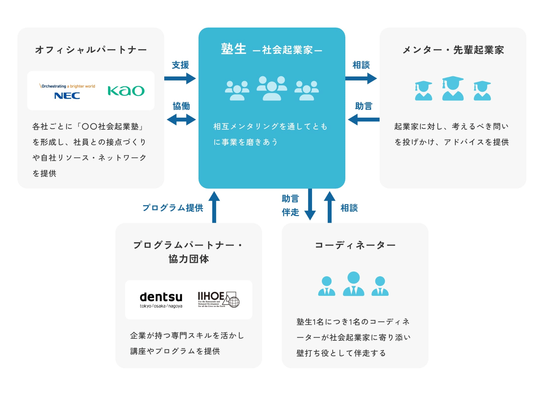 本プログラムには、卒塾生をはじめとした社会起業家、メンター、コーディネーター、事務局、パートナー企業・団体の5つのアクターが存在します。それぞれが自分たちの持つ強みや特性を生かして、社会起業家を支援しています。また起業家同士や、起業家とパートナー企業との協働事例も生まれており、新たな価値を提供しています。
