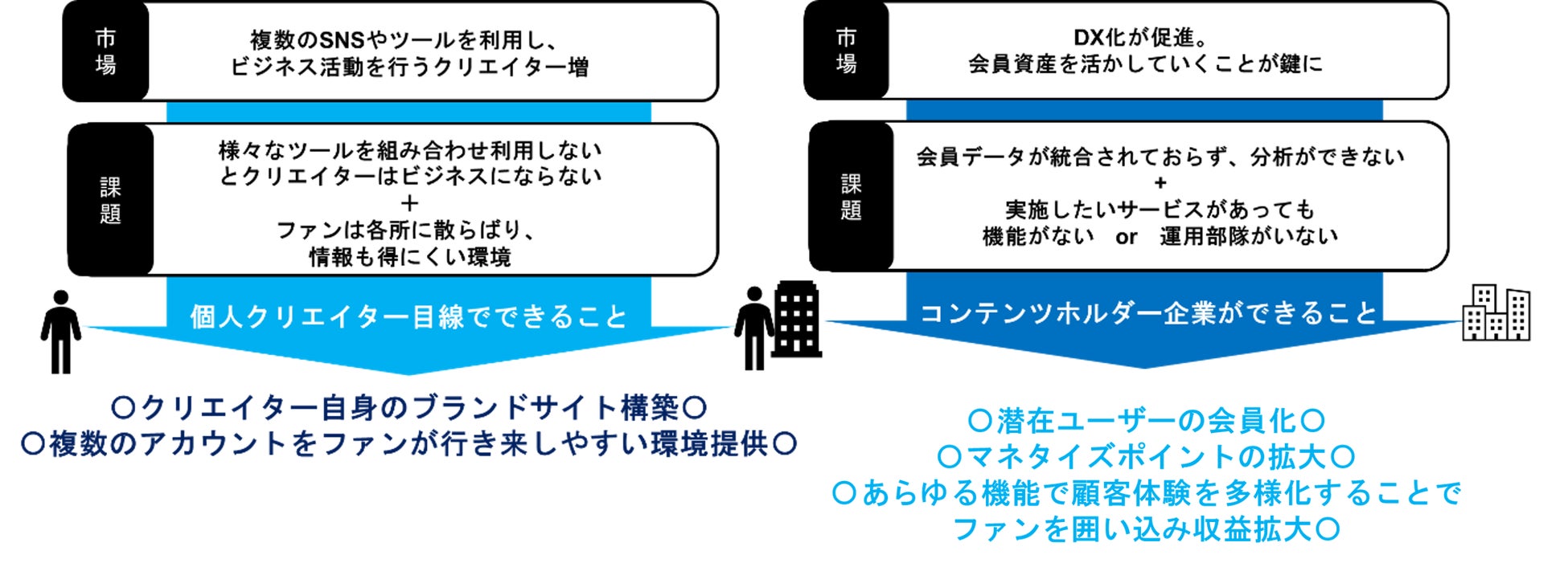 「サイバースター」は、クリエイターやタレント、レーベル、IPコンテンツホルダーなどのエンタメ業界において活動を行う方々や企業に対して収益向上を図るための包括的な活動を支援するとともに、ユーザーに対してもこれまでにない体験価値を提供することができるプラットフォームです。