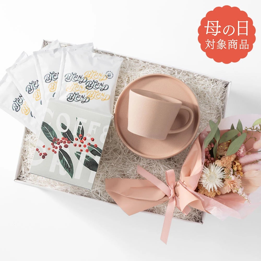 “美しい器づくり”を大切にする〈サクザン〉と、スペシャルティコーヒーのロースタリー〈オニバスコーヒー〉が贈るHYACCAオリジナルのギフトボックスに、母の日限定のミニブーケを添えました。温もりと華やかさを兼ね備えた、特別なギフトセットです。