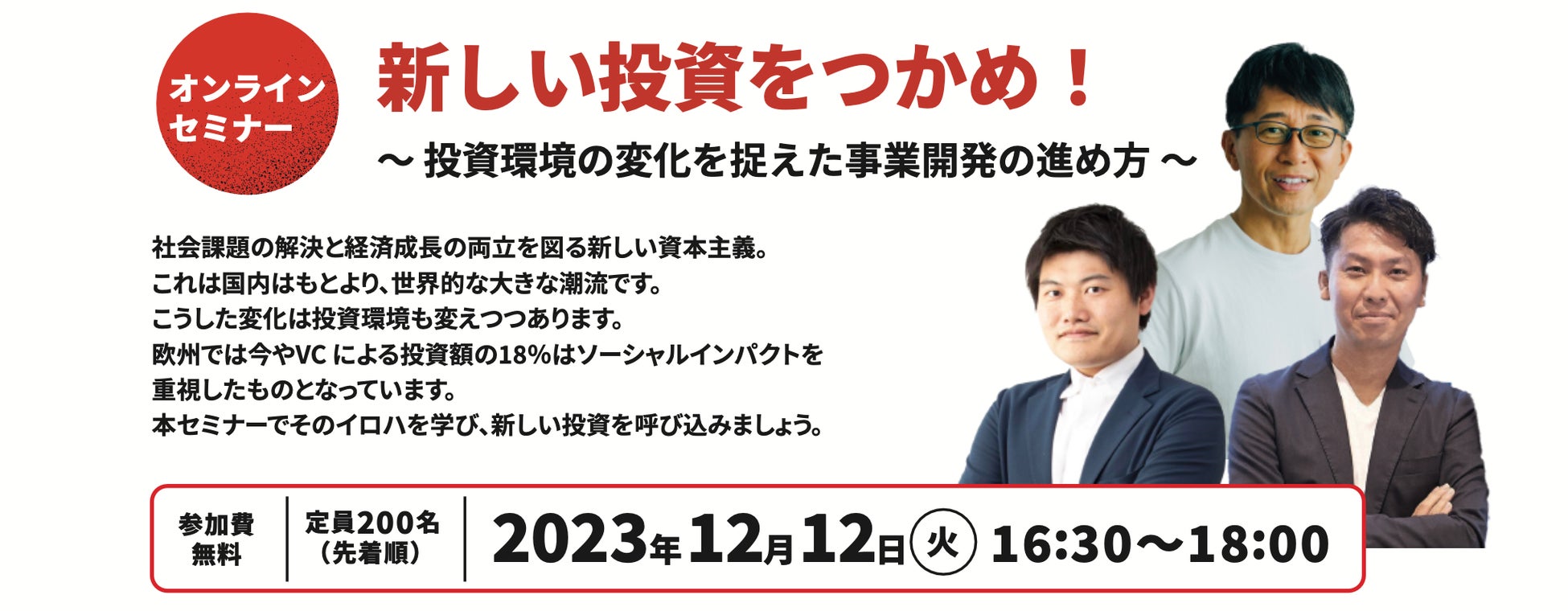社会課題の解決と経済成長の両立を図る新しい資本主義。これは、国内はもとより世界的な大きな潮流です。こうした変化は投資環境も変えつつあり、欧州では今やVCによる投資額の18%はソーシャルインパクトを重視したものとなっています。本セミナーでそのイロハを学び、新しい投資を呼び込みましょう。