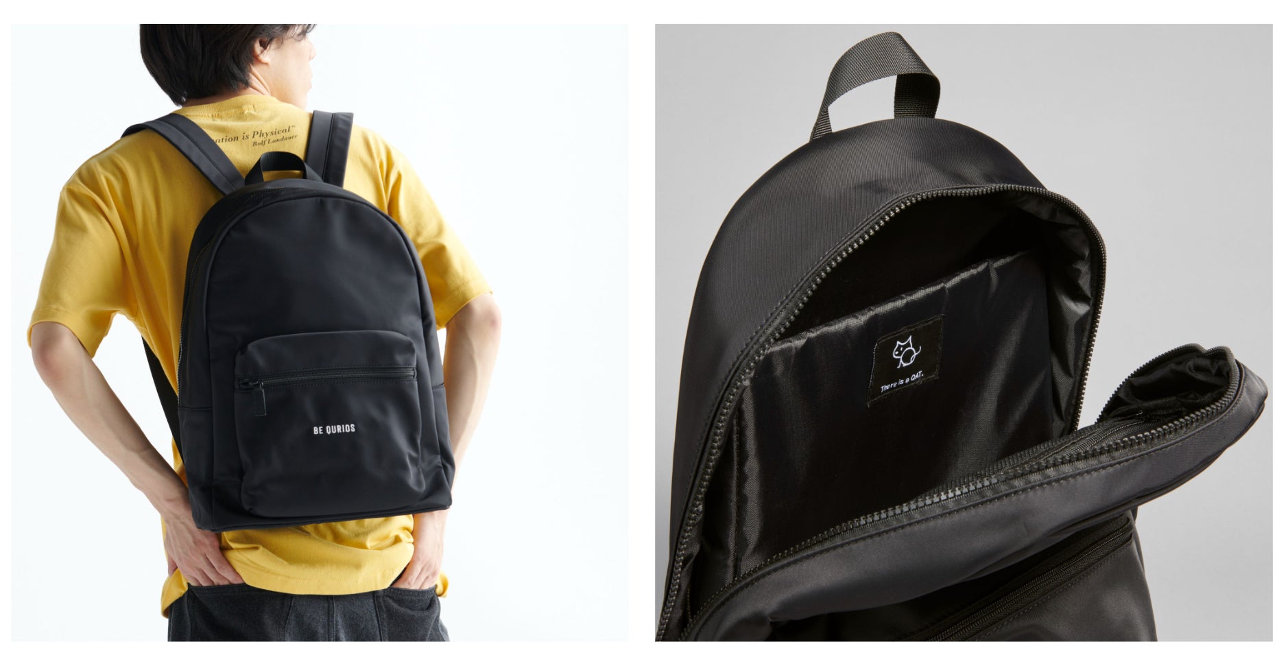 通勤通学に使いやすいシンプルなシルエット。大きめのノートPCが入るポケットと、メッシュ素材の内ポケットがついています。外ポケットにあしらわれた「Be QurioS」というロゴには「もっと好奇心で彩られた日常を!」というメッセージが込められています。