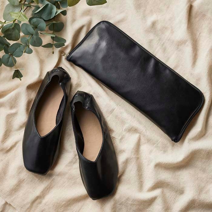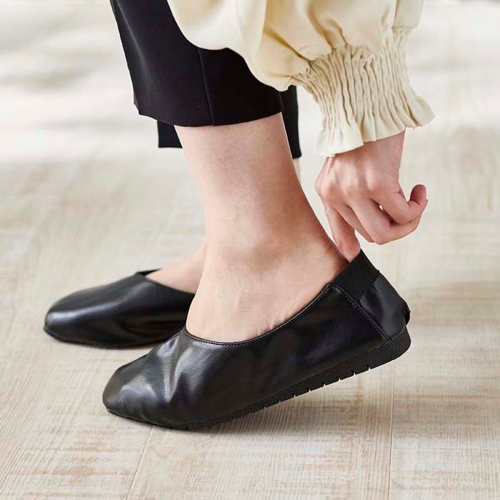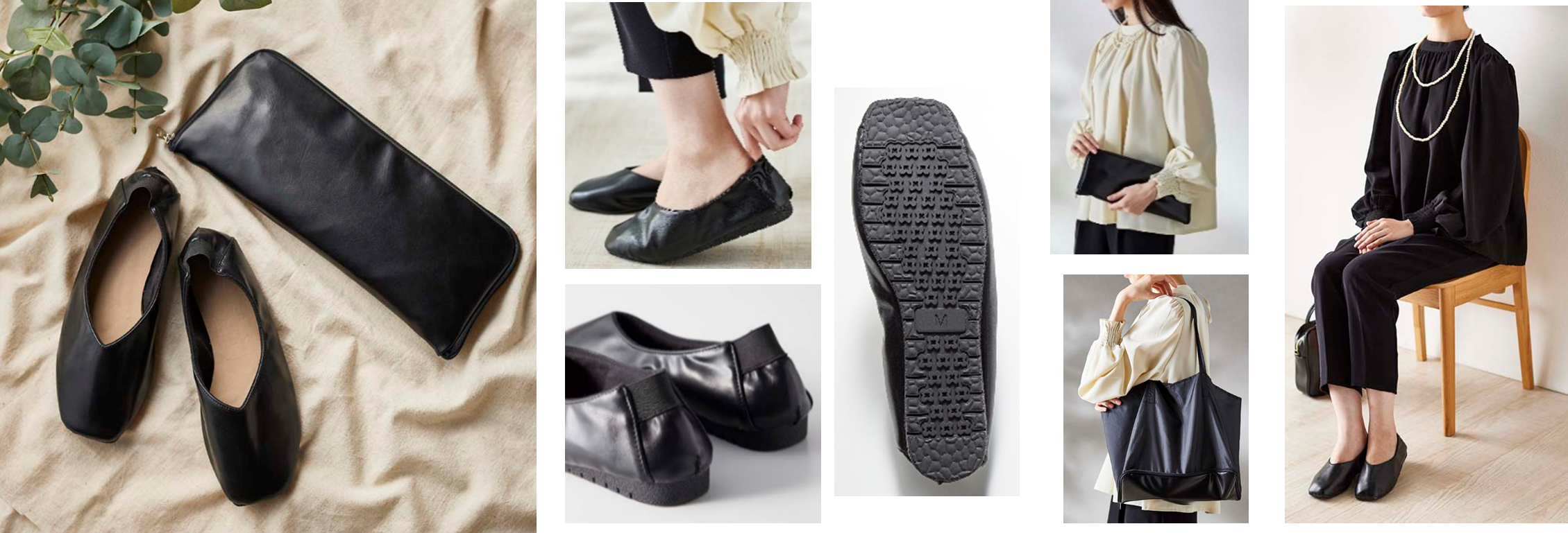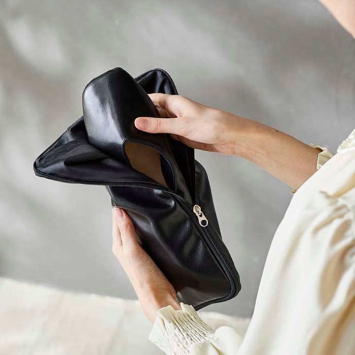 携帯スリッパへ求める機能についてアンケートを行った結果、約68%が「体育館で寒くない底冷えしないスリッパ」と回答。春先とはいえ体育館での式典は足元が冷えます。中には、もこもこの暖かいスリッパをもっていって恥ずかしい思いをしたという声も。そこで、携帯用スリッパとしては初の「底冷えしにくい仕様」※を採用することに。熱を伝えにくいラバー素材を採用し、さらにアルミシートをスリッパ全体に内蔵し、体温を反射させてあたためることで底冷えを軽減しました。また、その他に多かった「脱ぎ履きに手間取りたくない」、「外履きを入れる袋が必要」といったお悩みにも応え、収納袋から出してそのまま履ける仕様、またその収納袋を広げると外履きを入れることができる!という工夫を凝らした失敗しないハレの日のフォーマルスリッパが完成しました。※2023年12月時点 当社調べ