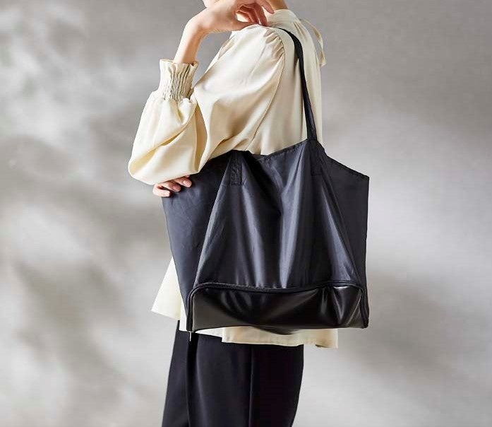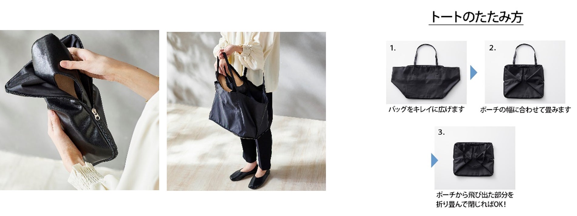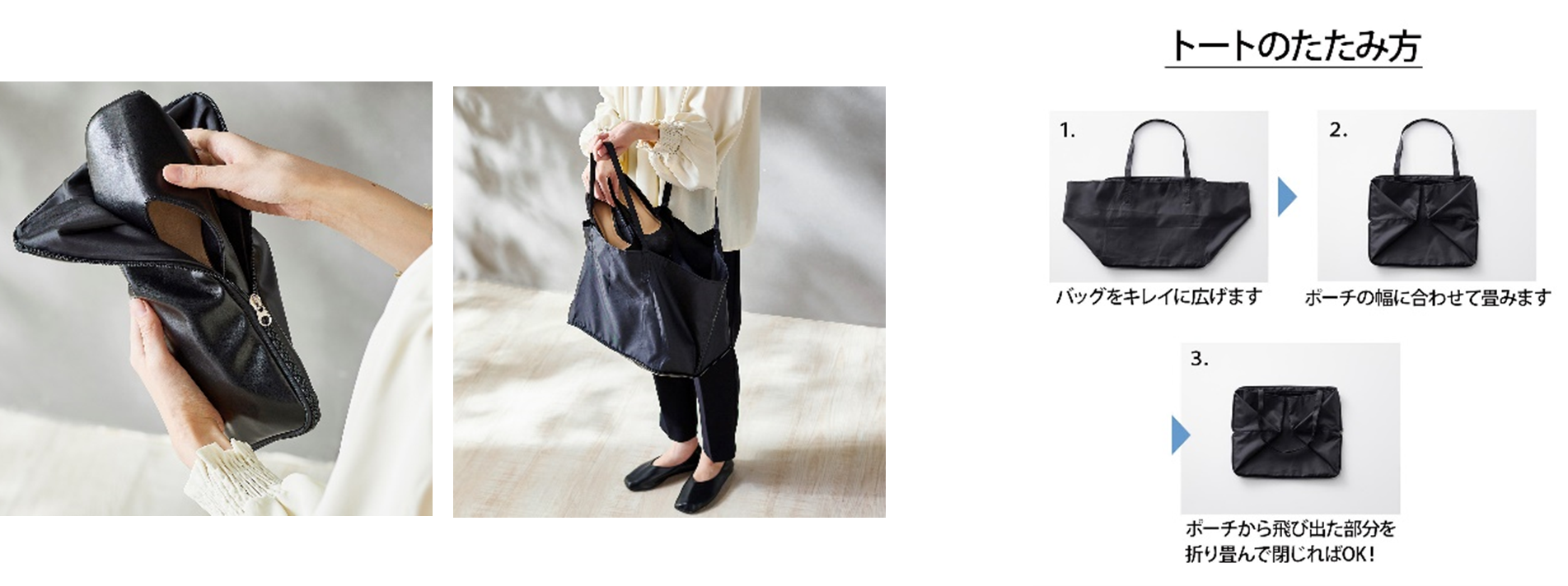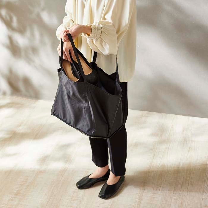 収納袋は、広げると外履きも入れられるトートバッグへ