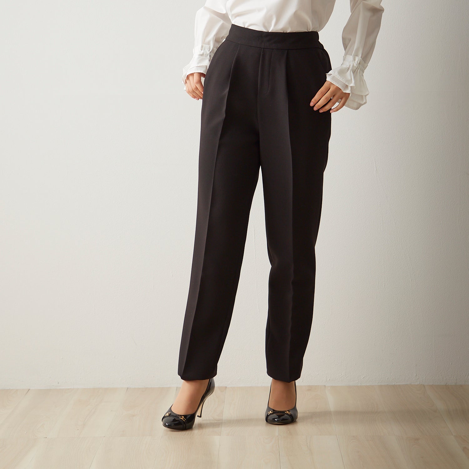 ・ジャケットと同素材のパンツはキレイ目なシルエットながらウエストゴムでラクな履き心地で普段使いにも。