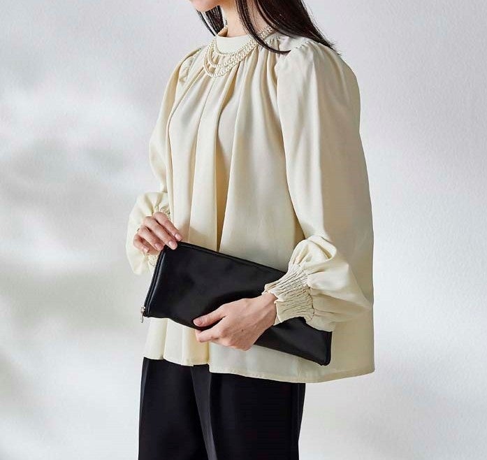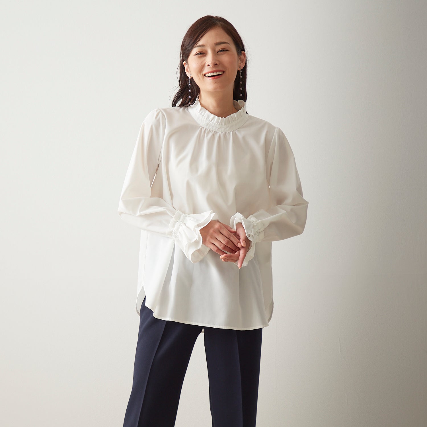 ・ジャケットと重ねて着ると、襟元や袖口からフリルがのぞくブラウス。1枚でも映えるので着回しにも。