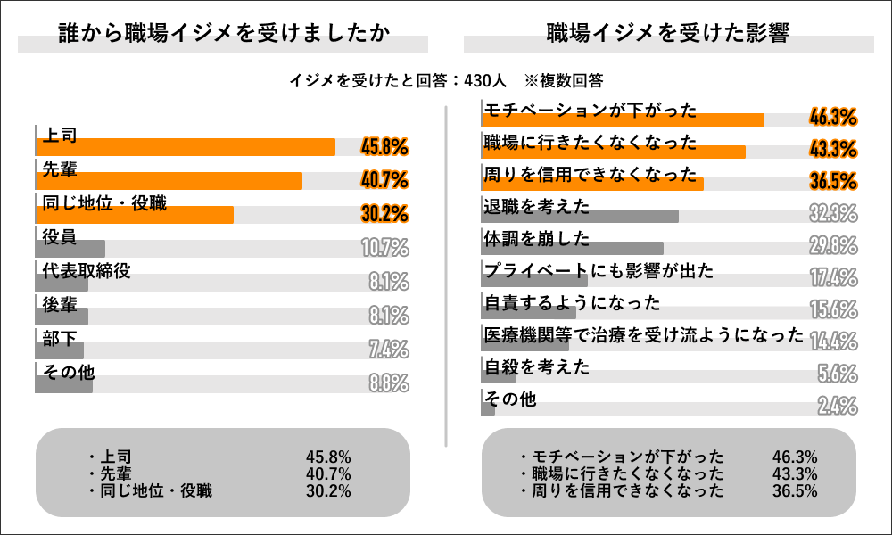 被害経験ありと回答した430人に、誰からの被害かを聞くと「上司」が45.8%で最多回答となり、次いで「先輩」が40.7%、「同じ地位・役職」が30.2%と、年上からの被害が多い結果となりました。また、被害後の影響を聞くと、「モチベーションが下がった」が46.3%で最多回答となり、次いで「職場に行きたくなくなった」43.3%、「周りを信用できなくなった」36.5%が上位3つの回答となりました。