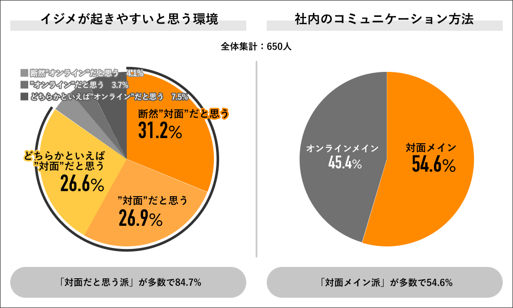 回答者全体の650人に職場イジメが起きやすいと思う環境を聞くと、「対面派」が84.7%、「オンライン派」が15.3%と、”対面派”が過半数を占めました。同回答者に社内のコミュニケーション方法を聞くと、対面メインが54.6%で多数派になり、オンラインメインが45.4%の結果となりました。