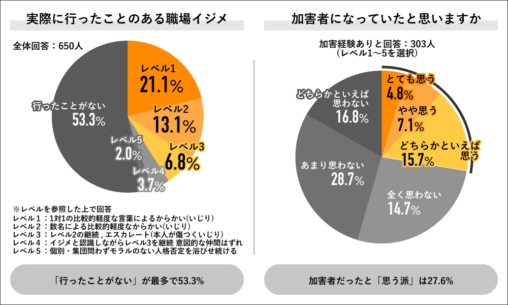 回答者全体の650人に、実際に行ったことのある職場イジメのレベルを聞くと「行ったことがない」が53.3%と最多となり、レベルの中では「レベル1:1対1の比較的軽度な言葉によるからかい(いじり)」が45.2%で最多回答となりました。職場イジメのレベルを参照した上で、同回答者に加害者になっていたと思うかを聞くと、「思わない派」が72.4%、「思う派」が27.6%の結果となりました。