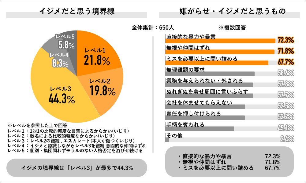 回答者全体の650人に職場イジメの境界線を聞くと、「レベル3の継続、エスカレート(本人が傷つくいじり)」が44.3%で最多回答となりました。嫌がらせやイジメだと思うものは、「直接的な暴力や暴言」が72.3%と最多回答となり、次いで「無視や仲間はずれ」71.8%、「ミスを必要以上に問い詰める」67.7%が上位3つの回答となりましたが、各回答項目で僅差の結果となりました。