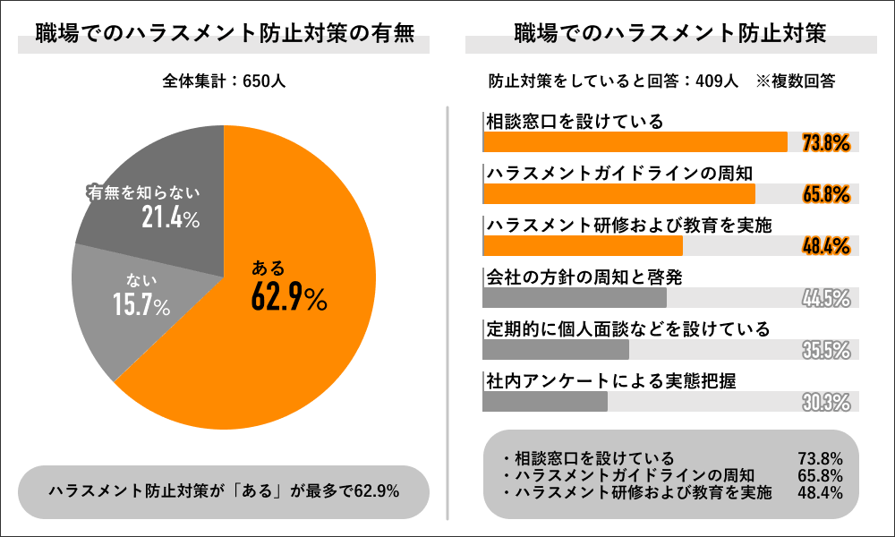 回答者全体の650人に職場のハラスメント防止対策の有無を聞くと、「対策あり」が62.9%、「対策なし」が15.7%、「有無を知らない」が21.4%と対策ありの職場が多い結果となりました。対策ありと回答した409人に具体的な防止対策を聞くと、「相談窓口を設けている」が73.8%で最多回答となり、次いで「ハラスメントガイドラインの周知」65.8%、「ハラスメント研修および教育を実施」48.4%が上位3つの回答となりました。