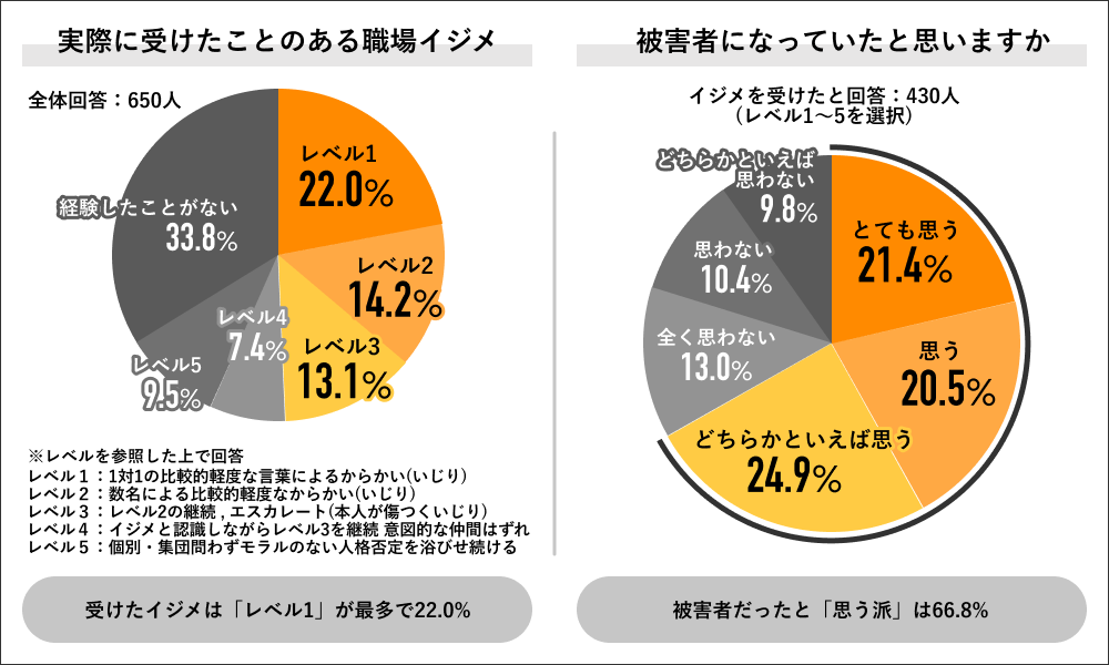 回答者全体の650人に、実際に受けたことのある職場イジメのレベルを聞くと「経験したことがない」が3.8%と最多となり、レベルの中では「レベル1:1対1の比較的軽度な言葉によるからかい(いじり)」が33.2%で最多回答となりました。職場イジメのレベルを参照した上で、被害者になっていたと思うかを聞くと、「思う派」が66.8%、「思わない派」が33.2%と、思う派が過半数を占める結果となりました。