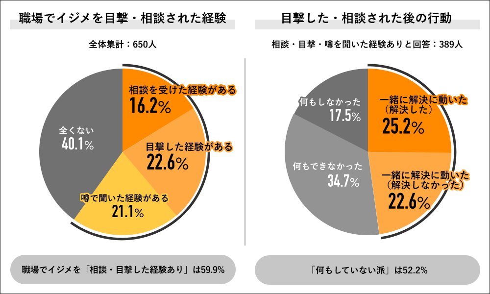回答者全体の 650人に、職場イジメの目撃・相談有無を聞くと、目撃・相談の「経験あり派」が59.9%、「経験なし派」が40.1%と、”経験あり派”が過半数を占めました。また、目撃・相談経験あり派を回答した389人にその後の行動を聞くと「何もしていない派」が52.2%と過半数を占め、内訳は「何もしなかった」17.5%、「何もできなかった」が34.7%でした。一方、「一緒に解決に動いた派」47.8%のうち「解決した」が25.2%、「解決しなかった」が22.6%でした。行動の有無に関わらず、解決に至らなかったケースが7割以上の結果となりました。