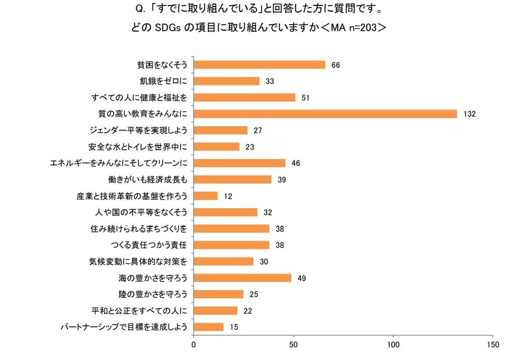 さらに、「SDGsに取り組んでみたいと思いますか<SA>」という問では、半数が「すでに取り組んでいる」(203)と回答しました。また、「どのSDGsの項目に取り組んでいますか<MA>」では、「質の高い教育をみんなに」(132)が全体の3割以上と最も多く、2位が「貧困をなくそう」(66)、3位が「すべての人に健康と福祉を」(51)と続きました。この結果からSDGsの中でも、経済的・身体的な“平等”への関心が高く、特に教育について注力する家庭が多いといえます。