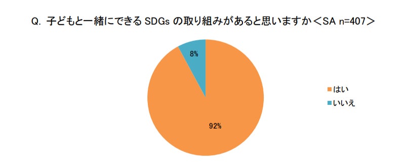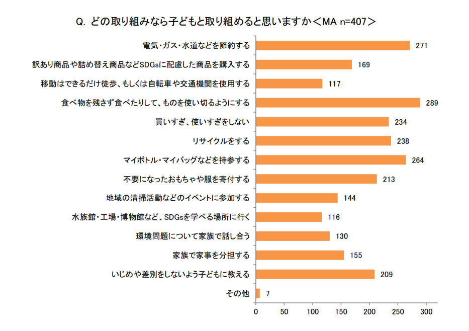 特に“モノを使い切る”など、日常生活に取り入れやすい行動は取り組むハードルが低いことが明らかに「子どもと一緒にできるSDGsの取り組みがあると思いますか<SA>」という問では、9割以上が「はい」(375)と回答しました。さらに、「どの取り組みなら子どもと取り組めると思いますか<MA>」については、「食べ物を残さず食べたりして、ものを使い切るようにする」(289)が7割以上と最も多く、続いて「電気・ガス・水道などを節約する」(271)、「マイボトル・マイバッグなどを持参する」(264)、「買いすぎ、使い過ぎをしない」(234)の3つの項目も6割前後の回答を集めました。このことから、日常生活で取り組みやすい行動であれば、子どもと一緒に取り組める認識が高いことがわかります。