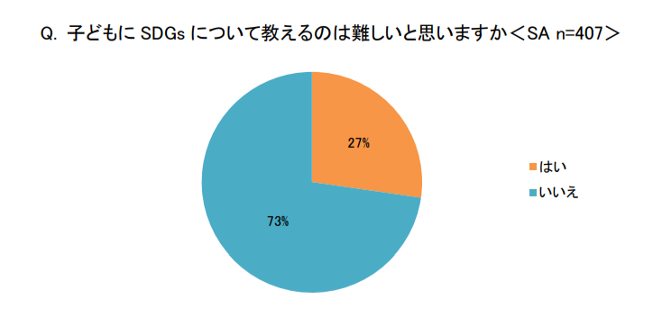 「子どもにSDGsについて教えるのは難しいと思いますか<SA>」という問では、「はい」(111)と回答したのが、3割未満にとどまりました。しかし、「SDGsについて家族と話し合ったことがありますか<SA>」という問に対しては、約7割が「いいえ」(274)と回答しました。SDGsは日常生活で取り組みやすい項目が多いことからも、子どもにも教えやすいものと認識している一方で、家族で話す機会を設けて、理解を深めている家庭は少ないことが伺えます。