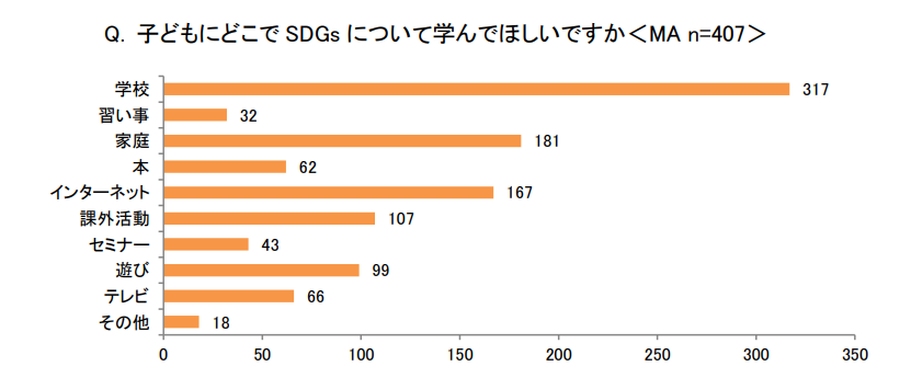 また、「子どもにどこでSDGsについて学んでほしいですか<MA>」では、約8割が「学校」(317)と回答し、また2位が家庭(181)、3位が「インターネット」(167)と続きました。この結果から、SDGs教育は家庭で取り組めると考える一方で、家庭で取り組みにくいSDGsの項目については教育機関でしっかりと学んでほしいという希望も多くあることが伺えます。さらに、約4割が「インターネット」と回答していることからも、今後はオンラインでのSDGs教育にも注目が集まることが予想されます。